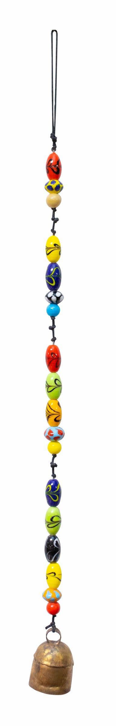 Triangular Multicolored Glass/with bells. NANA BELLS Originally used to keep track of cattle herds, these handcrafted bells are distinctive from any other types of bells from across the globe. Due to a secret family formula that is used to smelt various metals and attaching a hand hewed wood clapper the tune these bells make is uniquely melodic. For generations the formula has been passed on from one family member to the next.