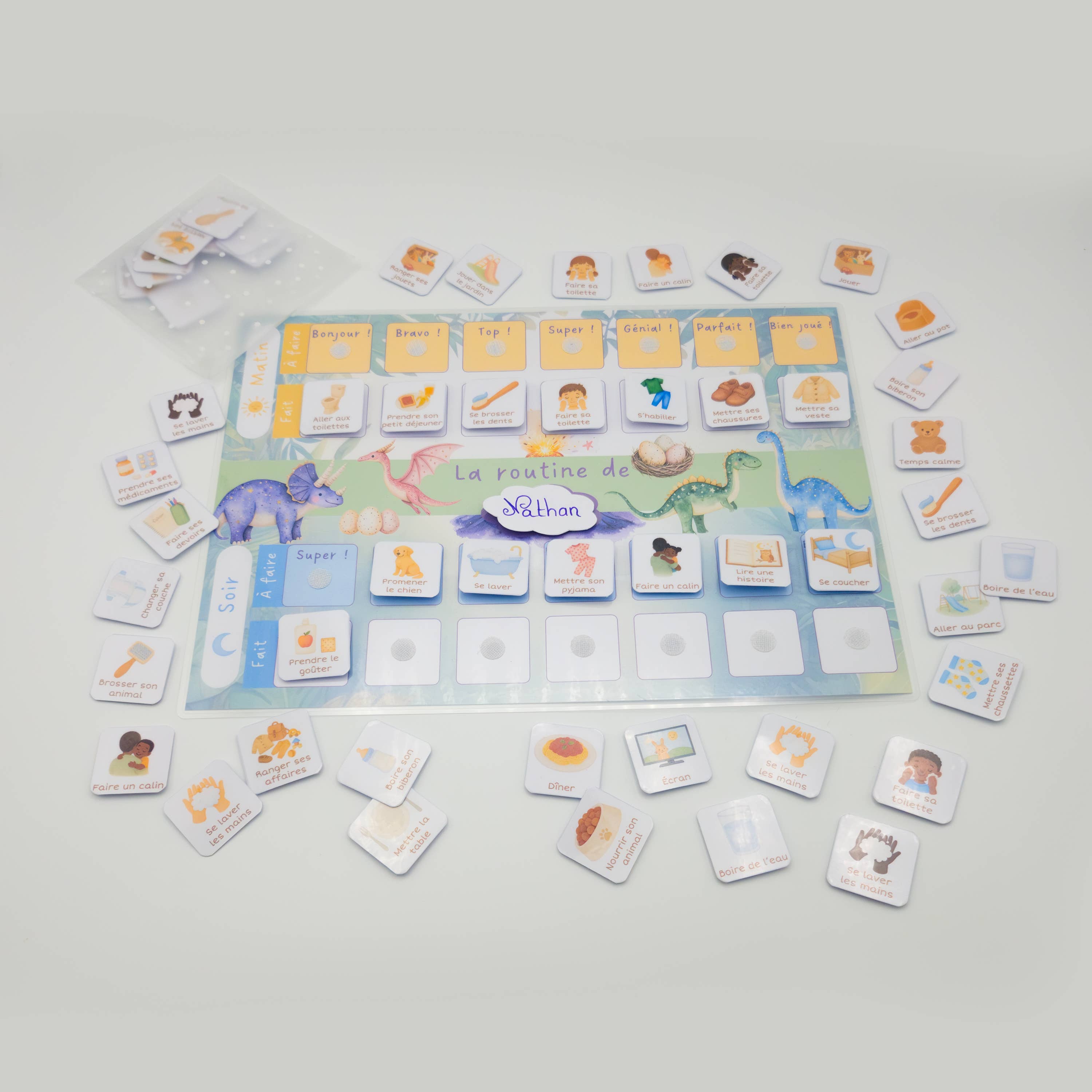 My Pretty Morning & Evening Routine - Autumn A gentle and playful routine kit to help children from 2 years old gain autonomy while having fun. Inspired by Montessori pedagogy, this visual aid supports children throughout their day with kindness and clarity. A real helping hand for parents during busy morning and evening times. The kit contains: 1 laminated A4 board, 54 action stickers with soft Velcro (easy to handle), a name tag, and a pretty storage pouch. The stickers are inclusive (girl/boy, 2 skin tones) and suitable for ages 2-6 (going to the potty / going to the toilet). The stickers have rounded corners and soft Velcro for delicate little hands and are made of thick laminated paper to withstand less gentle handling. Each sticker reveals a word of encouragement for each completed action. Particularly useful for helping children with ADHD or ASD structure their routine.