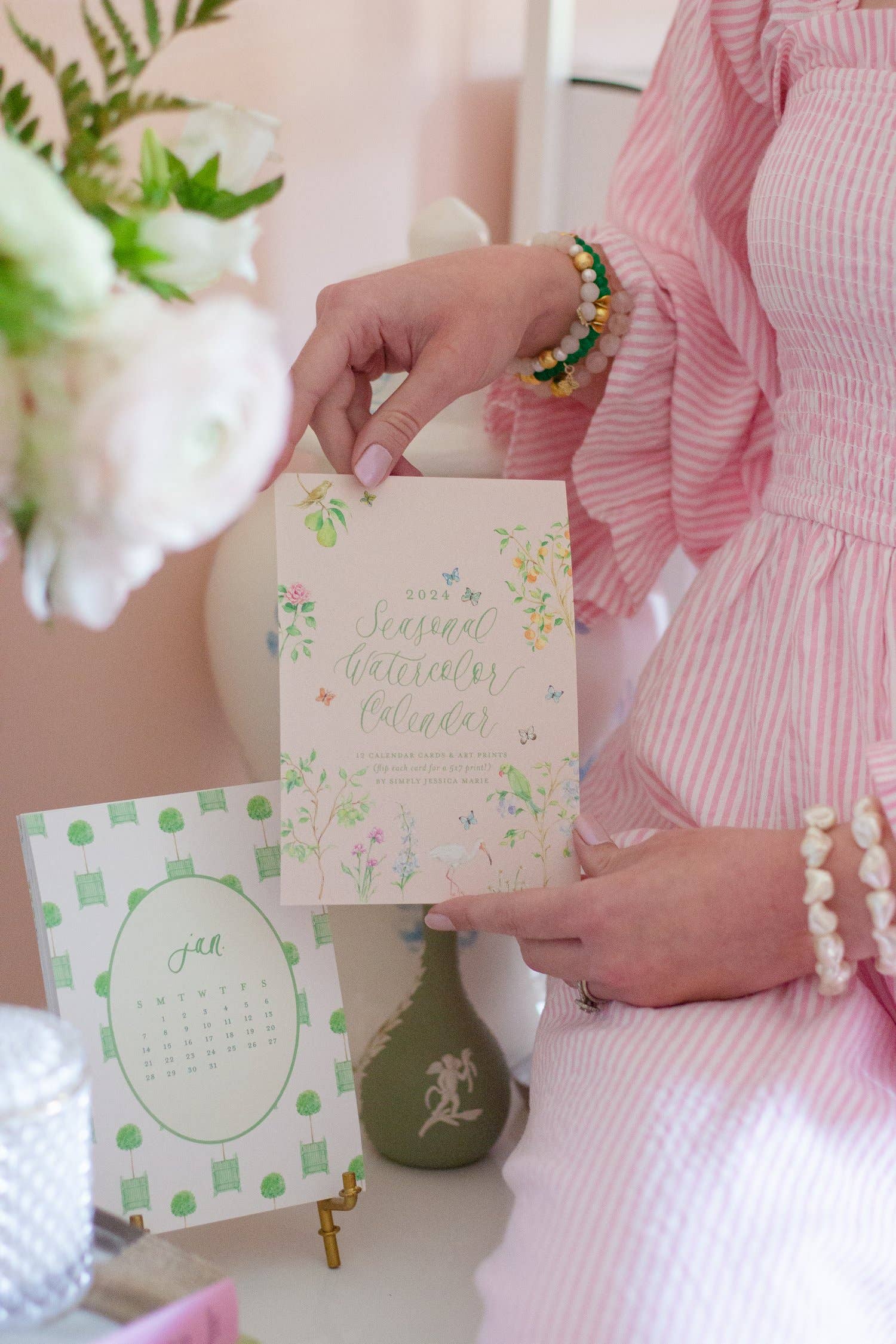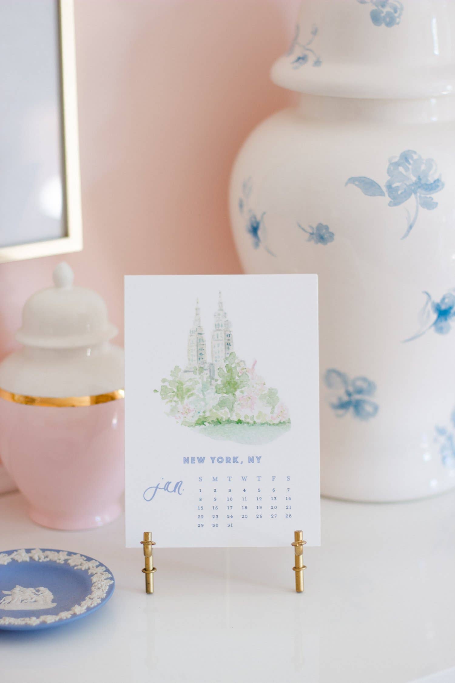Size: 5.5" square cards Gold bamboo easel not included Material: 120lb Eggshell Ultra White Paper. Packaged in white box with branded belly band 2026 is sure to be a beautiful year with this Seasonal Watercolor Calendar in your home! Each month contains a different festive, seasonal pattern for every month! This watercolor calendar runs from January-December 2026. The back side of each calendar card features a 5.5" art print of that month’s design. 12 gorgeous art prints to hang in your home, so you can continue loving this calendar well after 2026 comes to an end. These prints are also wonderful for gifting! Just pop the print in a frame and it's the perfect gift. (Gold bamboo easel not included)
