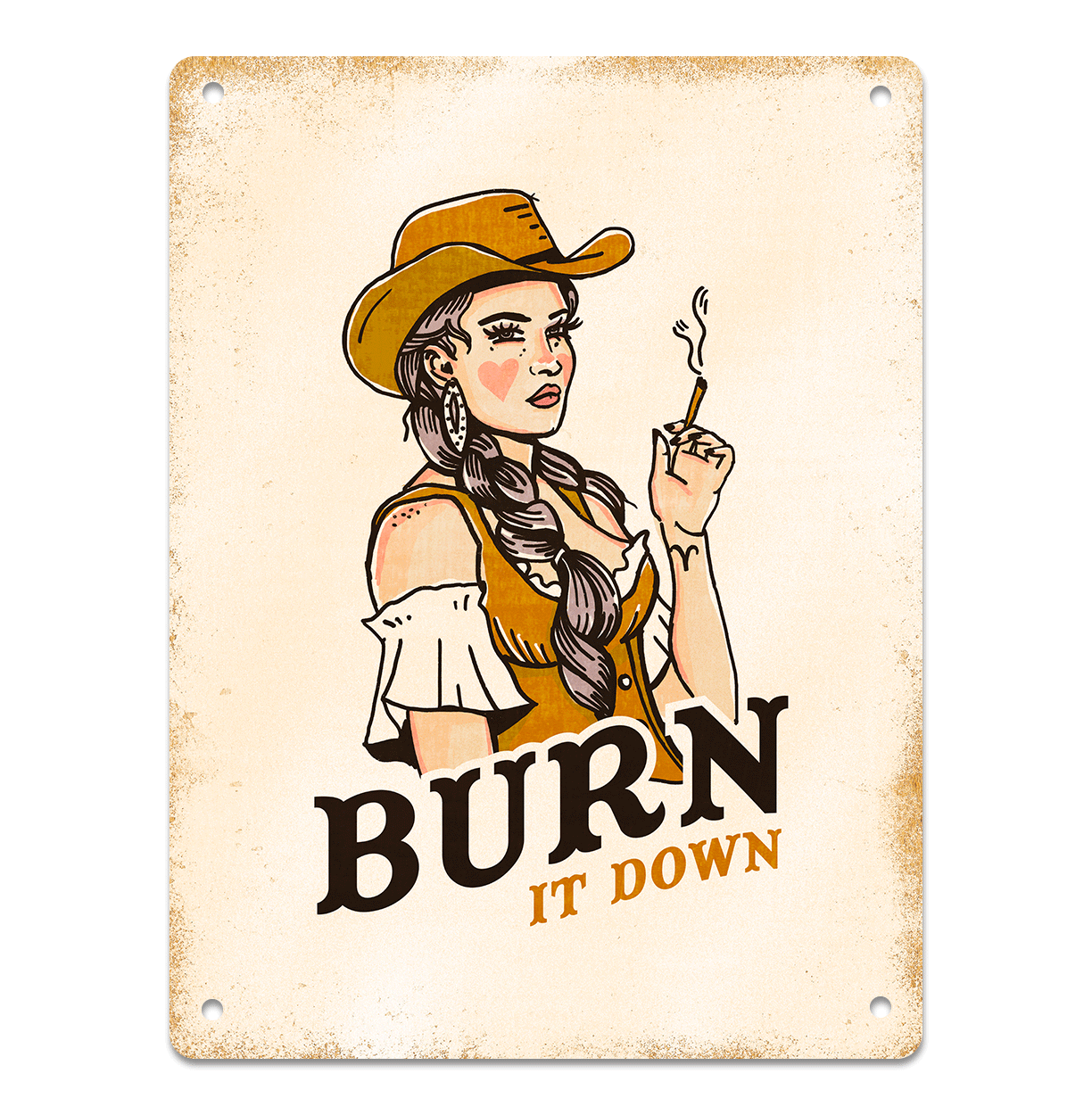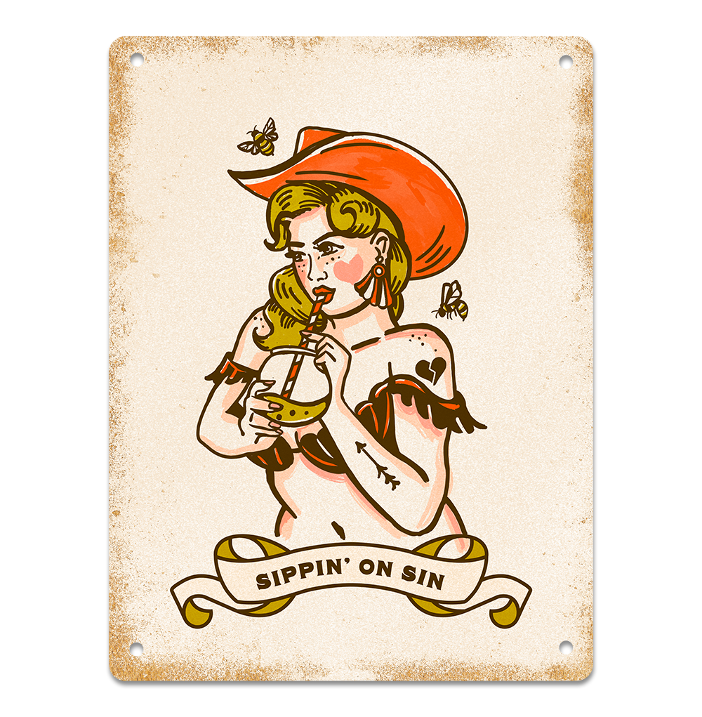 14 x 10.5" tin tacker style aluminum sign art print. Sipping on sin is a cheeky & fun vintage metal sign featuring a country music cowgirl pinup illustration & a funny saying. A great birthday present or Christmas gift for men & women who love retro decor or have a funny & cheeky style.