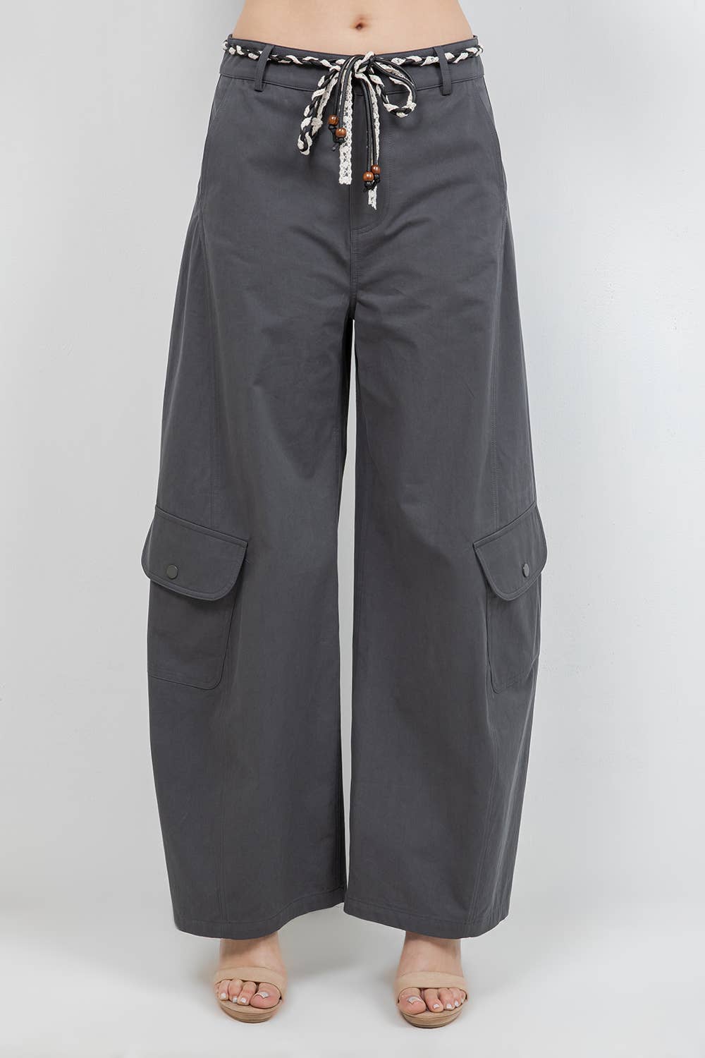 - Elastic Waist Solid Woven Cargo Pants - Utility Pants - Side Pockets - W/ D Rings (Model height: 5'7", wearing a Small, 2-2-2- Size Ratio)