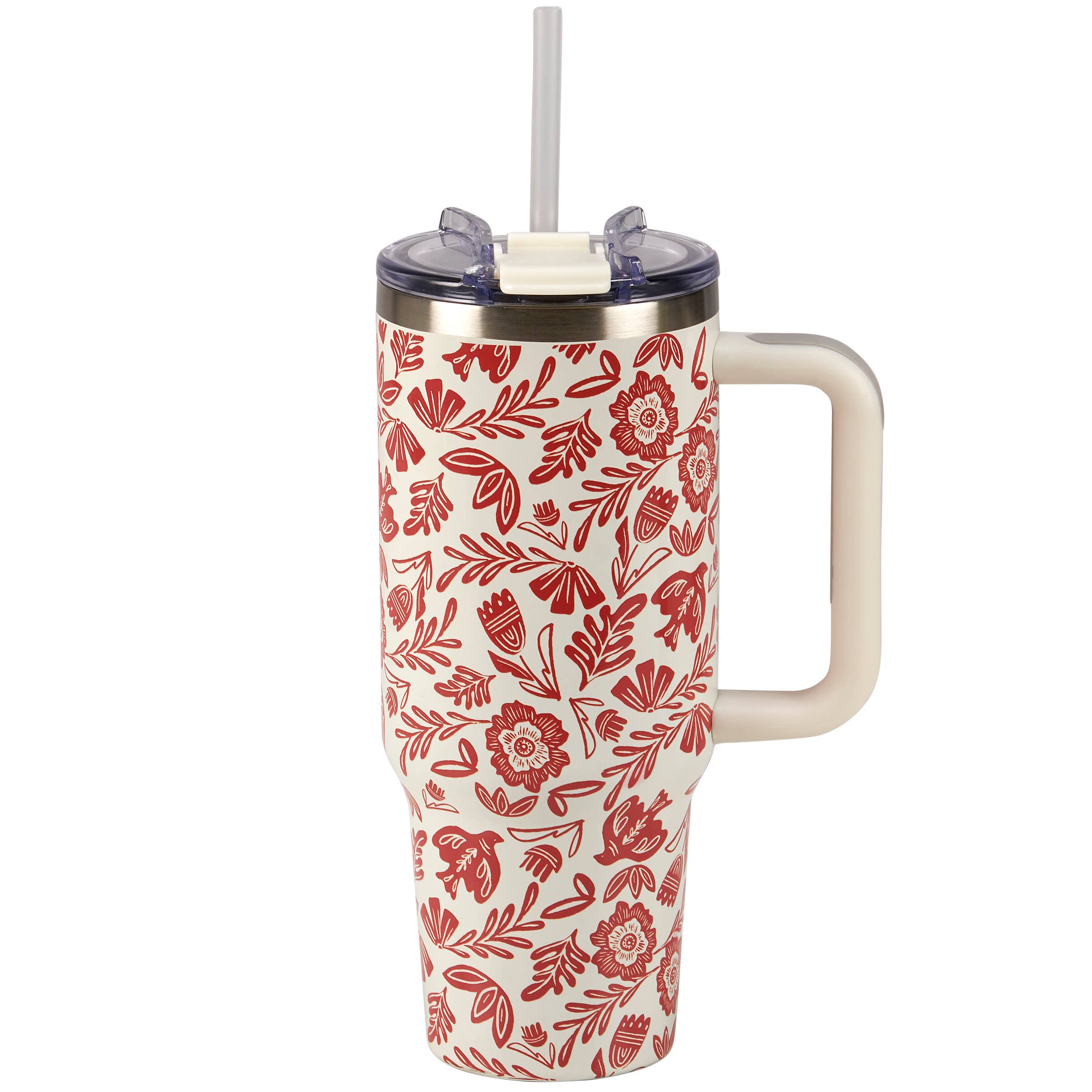 A 40 oz stainless steel travel mug from our Garden Collection displaying a full wrap-around design of colorful mixed florals. Design is replicated from original art hand painted in a delicate watercolor style. Our Mixed Florals travel mug is insulated to keep beverages hot for 7 hours or cold for 11 hours and features a large handle as well as a narrow base that fits most cup holders making it great for on the go. Insulated travel mug includes a reusable straw and multipurpose lid with sip opening that can also be used with straw. Hand-wash only; do not microwave. A charming garden-themed accessory perfect for on-the-go.