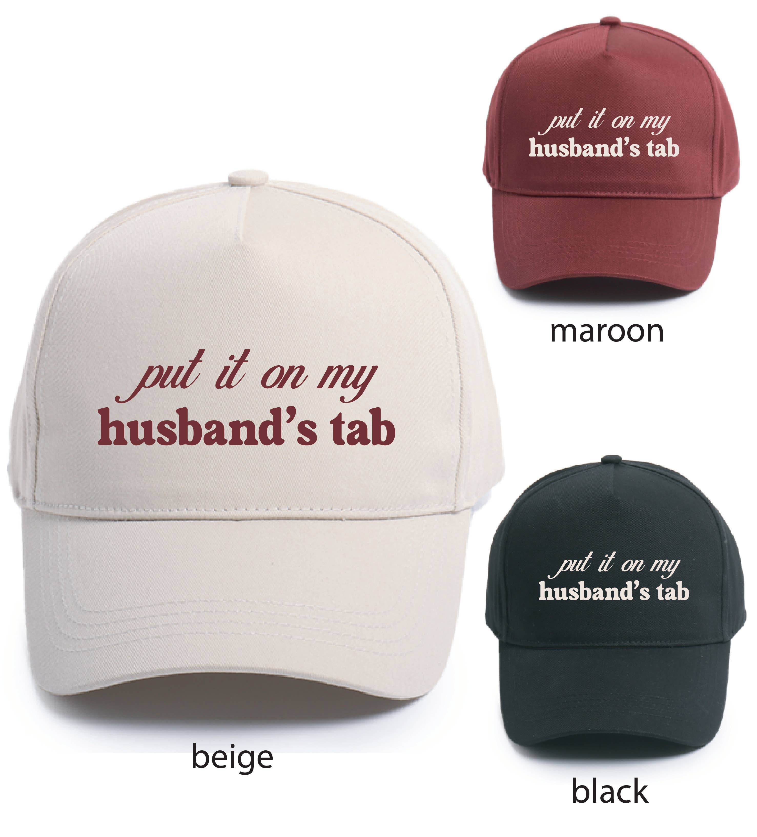 Two-tone baseball hat featuring the embroidered phrase "Put It On My Husband's Tab." Designed with a curved brim and an adjustable back strap, this cap combines humor and style. DIMENSION: Height: 4.75" Brim: center 3" Circumference: 22" Adjustable strap in the back Material: 100% Polyester