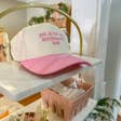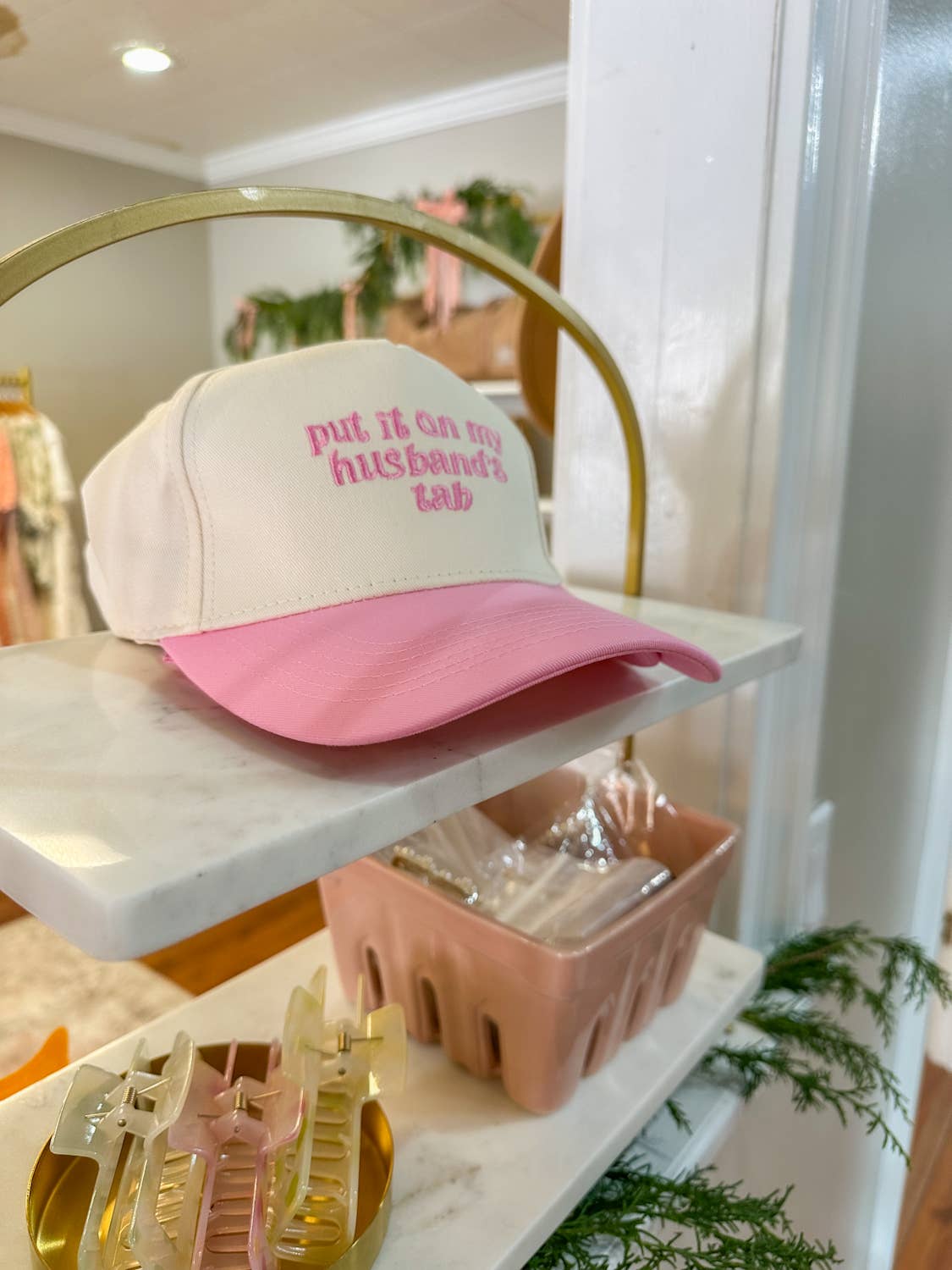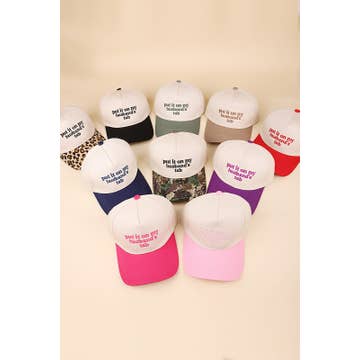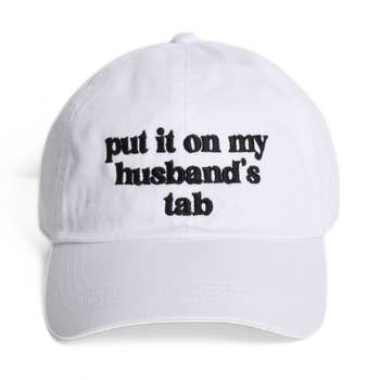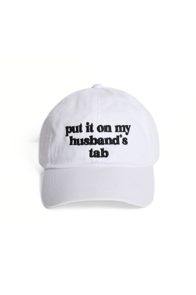 Two-tone baseball hat featuring the embroidered phrase "Put It On My Husband's Tab." Designed with a curved brim and an adjustable back strap, this cap combines humor and style. DIMENSION: Height: 4.75" Brim: center 3" Circumference: 22" Adjustable strap in the back Material: 100% Polyester