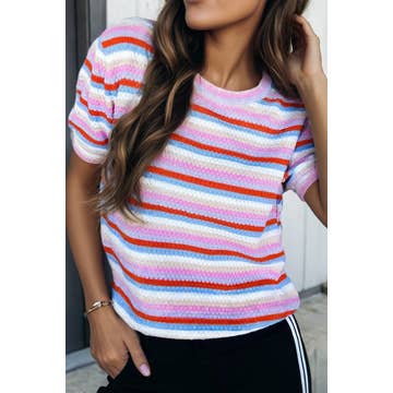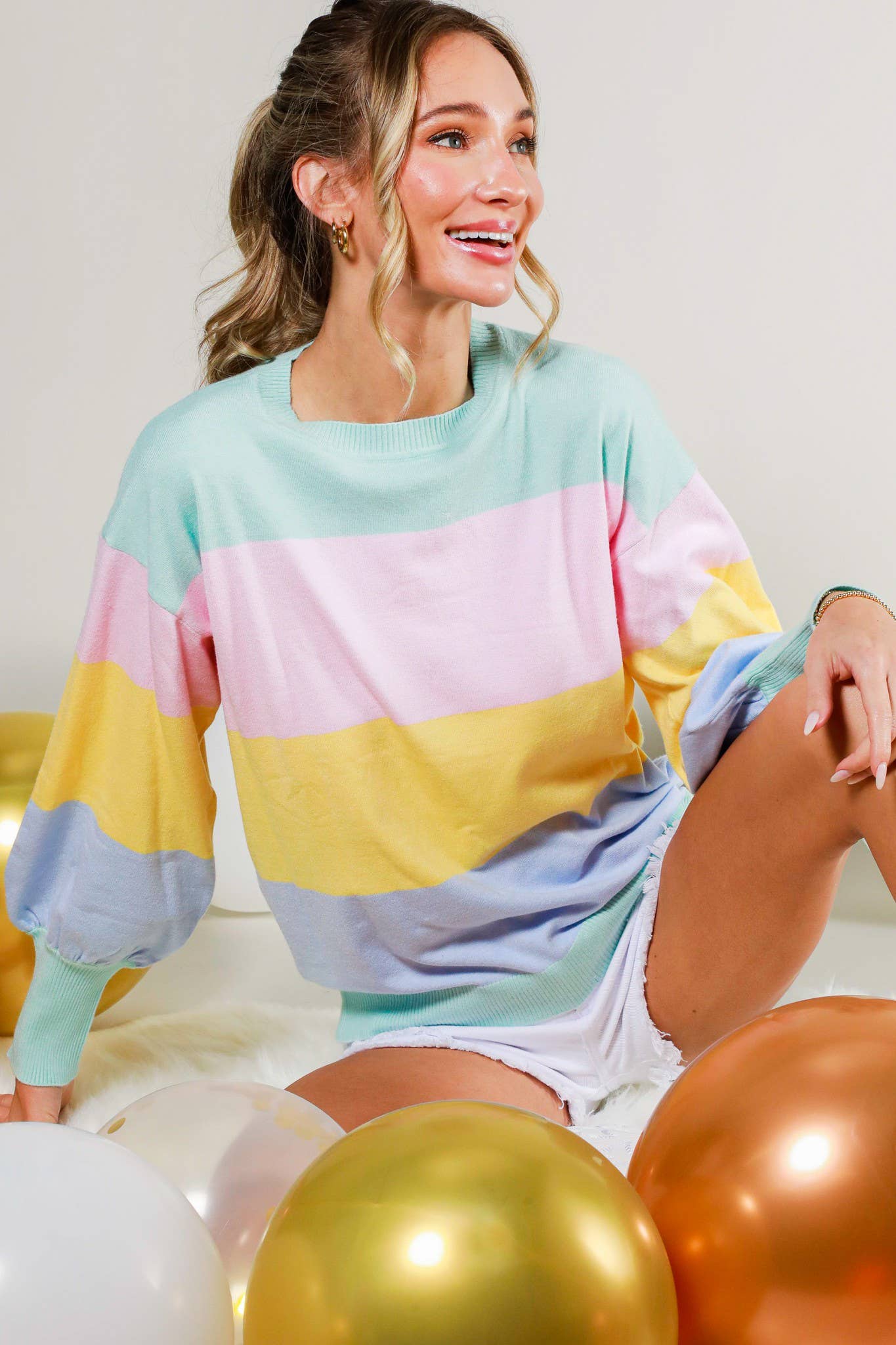 This buttery soft lightweight sweater is the perfect way to bring a pop of color into the fall and winter. Pair with jeans or your fav lounge pants or shorts for a colorful look! puff sleeve detail!!! Color: Cream + Rainbow detailing Fabric: 100% Cotton