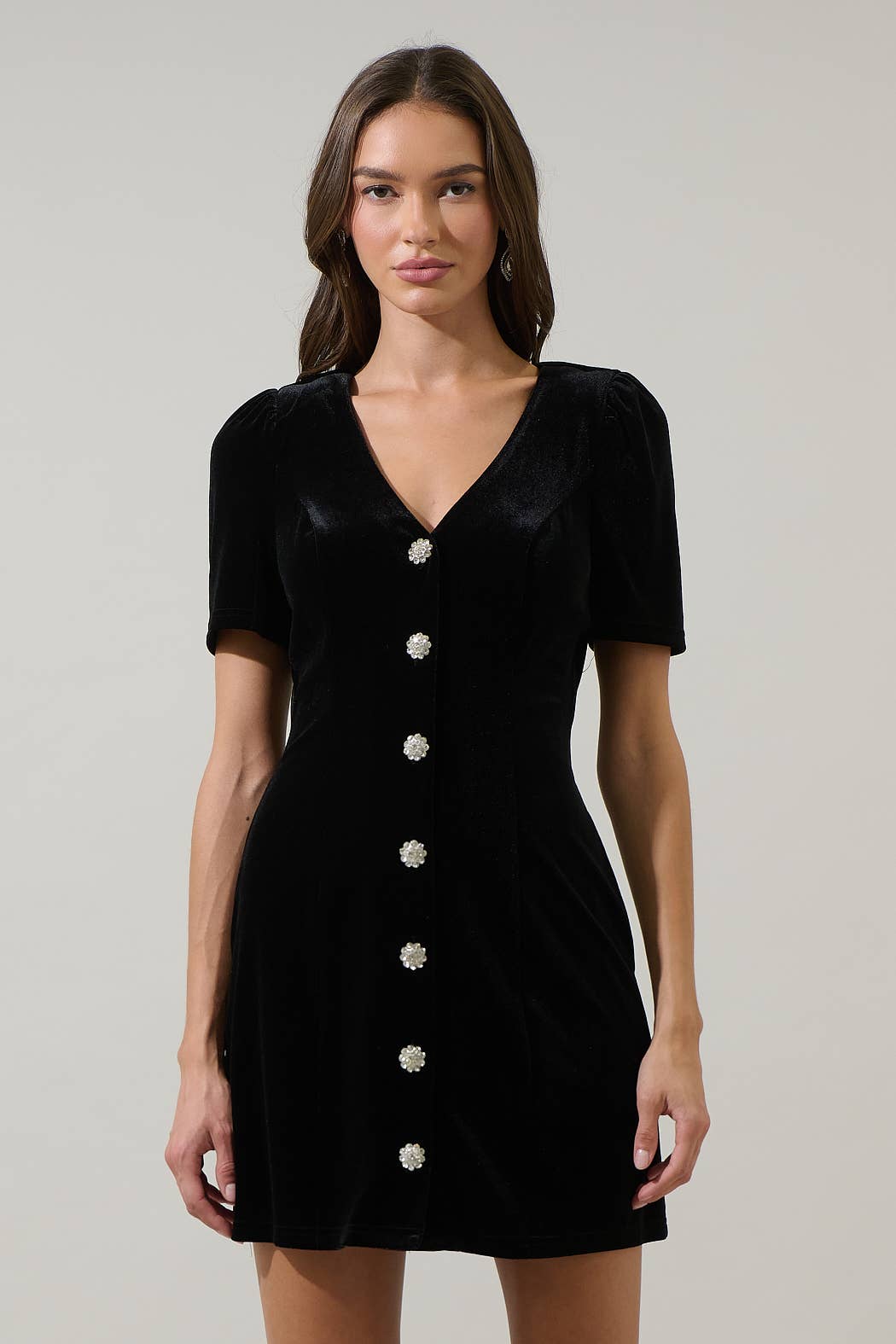 Looking for an elegant mini dress? This velvet mini is the perfect mix between the ideal holiday and fall dress. Features a gathered shoulder on a short sleeve that frames a shapely silhouette and has gorgeous silvers button’s all the way down. Princess seams pave the way along the front panels, lying parallel to a hidden zipper closure. - Velvet - Button up mini dress - Princess seams - Pockets - Comes in 2 colors Size + Fit - Model is 5'10" and wearing size XS - Measurements taken from size S - Chest: 17 1/4" - Length: 34"