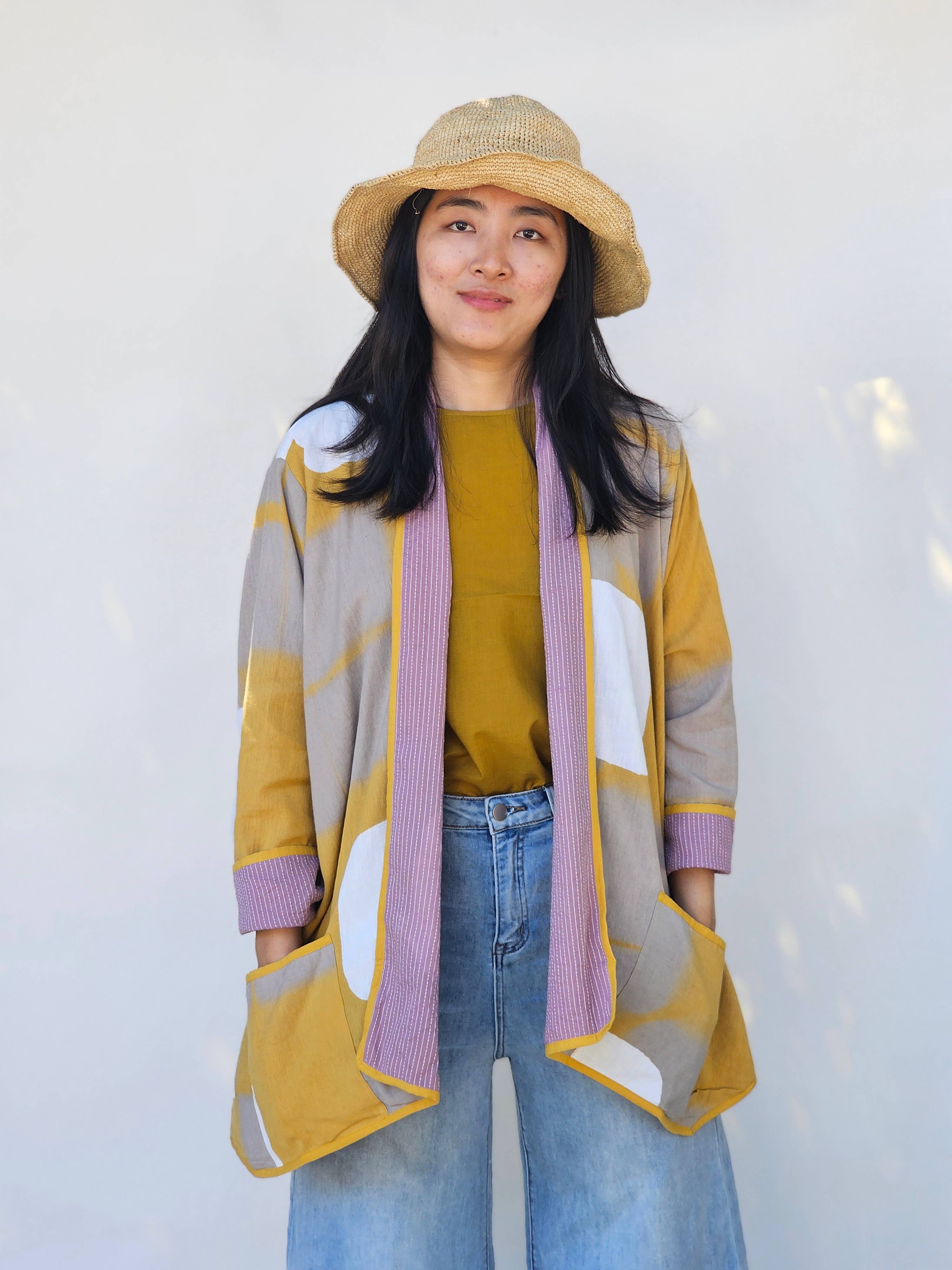 Made with traditional Bengali quilts called "Kanthas," expertly crafted from repurposed saris and fabrics, each Anoushka Jacket is a unique creation curated for your comfort. These reversible jackets feature gender-neutral sizing and embrace a silhouette inspired by the timeless aesthetics of Asian street style. The jacket's oversized kimono design boasts capacious pockets, ideal for stowing away essentials such as snacks, lip balm, your phone, and even a wallet. The essence of the Anoushka Jacket encapsulates our dedication to the women who motivate us, embodied in every Otto Finn creation. Crafted from sustainable materials and crafted in Pittsburgh, PA, our women-led Otto Finn team takes pride in creating a collection that upholds our commitment to the environment. Sizing: Designed with inclusivity in mind, our gender-neutral sizing ranges from XXS-XXL, for example XXS offers a fit similar to an oversized women's XS. For precise measurements, kindly refer to our size chart.