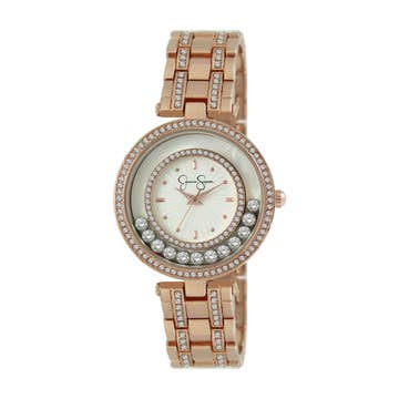 316L Surgical-Quality Stainless Steel Case Jeweled Automatic Movement Jewel Bearings: 22 Jewels 36-Hour Power Reserve Beats per Hour (BPH): 21600/Hour Sapphire-Coated Mineral Crystal Mother-of-Pearl Dial Semi-Skeleton Dial 8 Crystal Markers on Dial Observation Caseback to view Movement Crystal Set Bezel Genuine Leather Crocodile-Embossed Strap Logo-Engraved Stainless Steel Clasp Luminous Hands 39mm Diameter 5 ATM Water Resistance