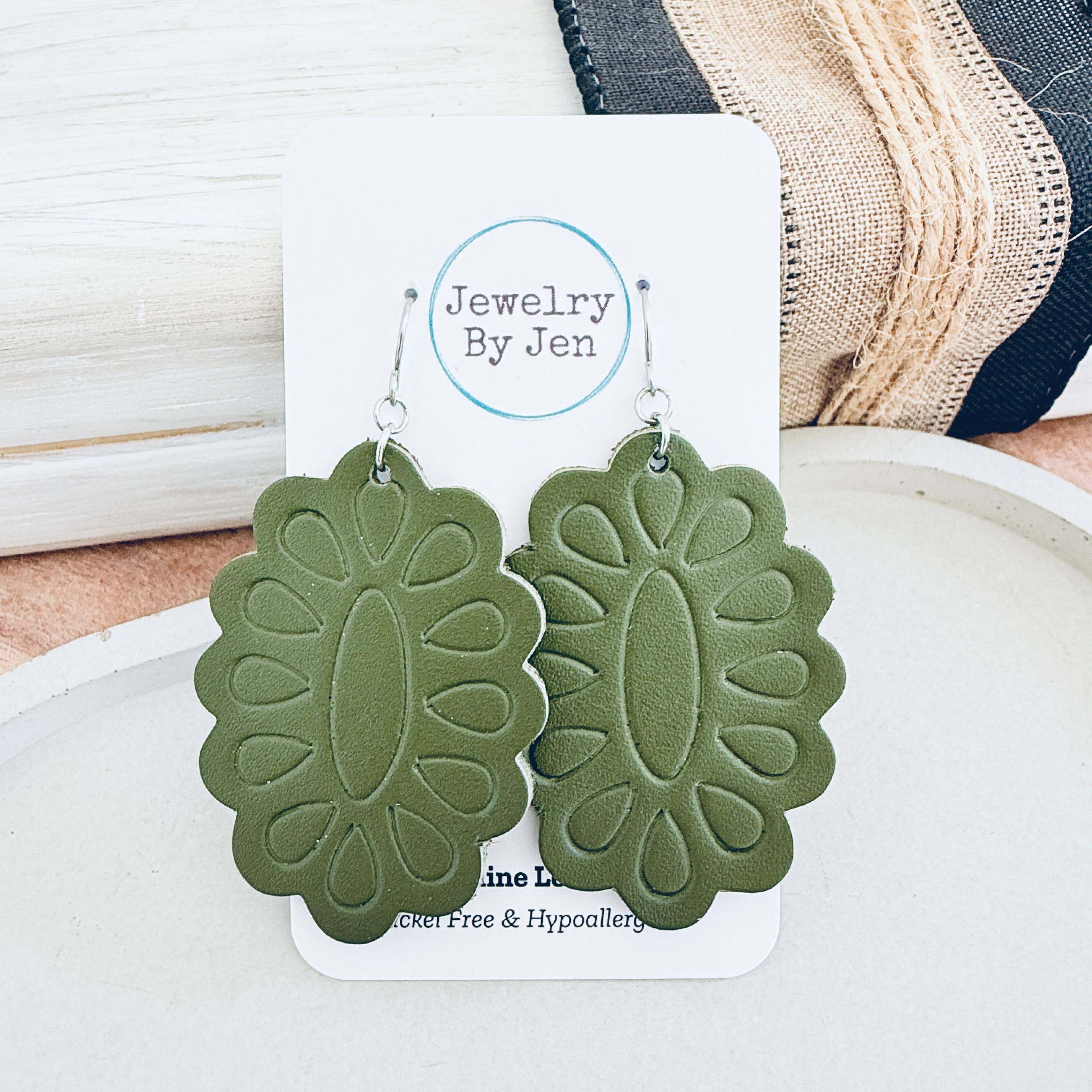 Genuine Leather Measures 2.5" long x 1" wide Stainless steel hook Nickel free and hypoallergenic Due to display settings on your device, colors may appear different