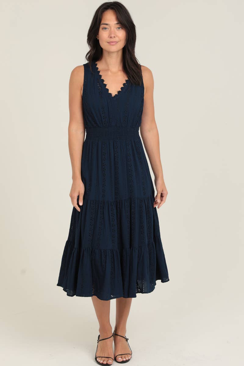 Available in XS and XL. Extended sizing available upon request. Cutout embroidered midi wrap dress with short flutter sleeves, side tie closure, and a ruffle trimmed hem. The perfect daytime Resort dress. Skirt lining attached.
