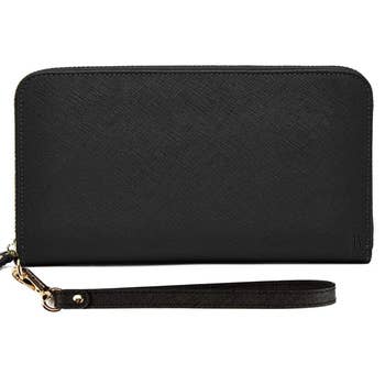 Quality vinyl material and uniquely designed Button clasp closure. Includes a detachable 6" wristlet strap. Interior: 2 pockets, 1 zippered pocket, 9 card and 1 ID slots. Measurements: 5" (L) x 1.5" (W) x 8" (H)