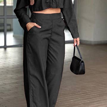 buttoned vest top wide leg pants set style: chic,elegant type: pants sets material: 97%polyester,3%elastane neckline: v-neck sleeve style: sleeveless length: long pattern type: plain decoration: button fit type: regular occasion: work fabric elasticity: slight stretch sheer: no care instructions: machine wash or professional dry clean