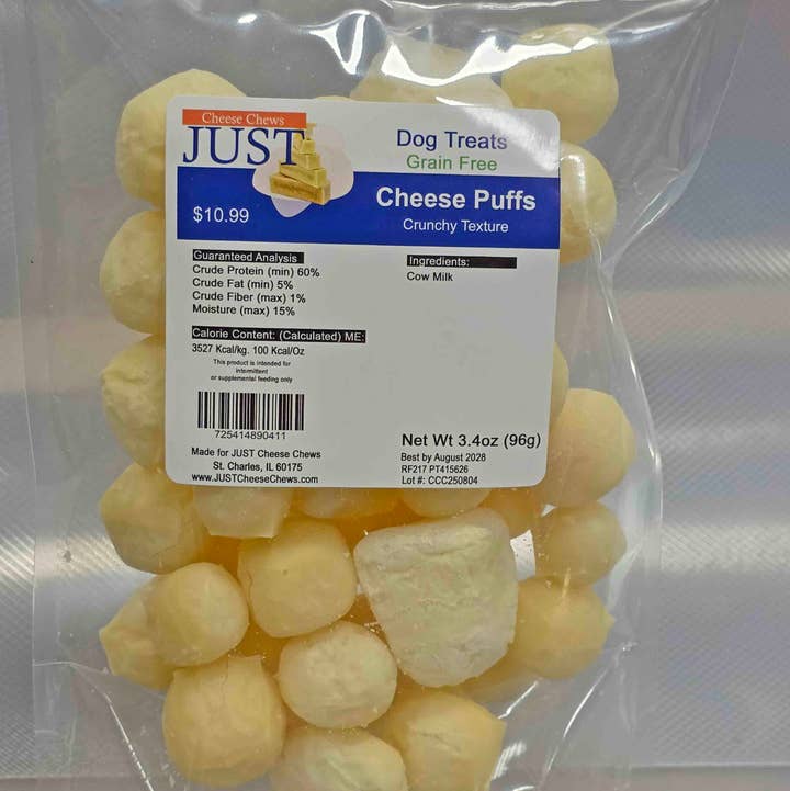 These are made from our top-of-the-line Himalayan yak cheese chews. They are microwaved pieces about 1x1 inches. This is a one-pound bag, but you can also order them in 3.4-oz bags (96g) with or without a label. Let's chat if you want them with your own label We show these in retail bags in the photo, but they come in a 1 or 2 lbs ziplock bag These puffs are manufactured in Belgium. They are a crunchy treat and are easy to crush.