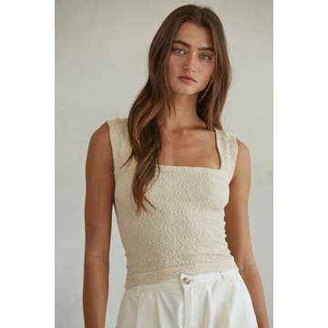 This unique, seamless jacquard tank top is crafted from a blend of Modal, Nylon, and Spandex for a comfortable and stretchy fit. The square neckline, sleeveless design, and all-over floral print create a vintage-inspired look. The ribbed knit construction and cropped length offer a modern and flattering silhouette. Pair it with high-waisted jeans or a skirt for a stylish and feminine outfit. (One Size)