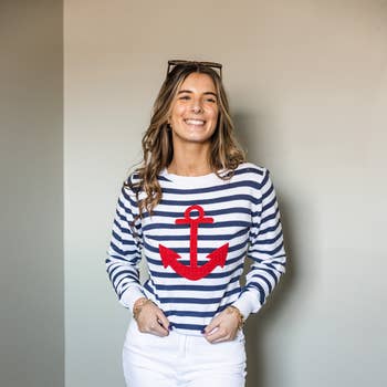 Set sail in style with this bestselling anchor sweater – a must-have for any coastal-inspired collection. Featuring a bold, contrast anchor design front and center, this soft-knit pullover blends laid-back charm with nautical flair. It's lightweight yet cozy, perfect for layering through every season. Offered in four versatile colors – Navy, Neutral, Beach Sky, and Ivory – this style moves easily from dockside to downtown. Designed with a flattering fit and comfortable stretch, it's a customer favorite for boutiques seeking standout, easy-to-wear styles. Details: Style #: F2112 Soft knit fabric with a hint of stretch Bold anchor graphic on front Available in Navy, Neutral, Beach Sky & Ivory True to size with a relaxed fit Great for spring, summer, or layering into fall Perfect for coastal boutiques, gift shops, or travel/resort wear retailers Anchor sweater, nautical pullover, coastal boutique clothing, women’s casual knitwear, beach style, transitional layering