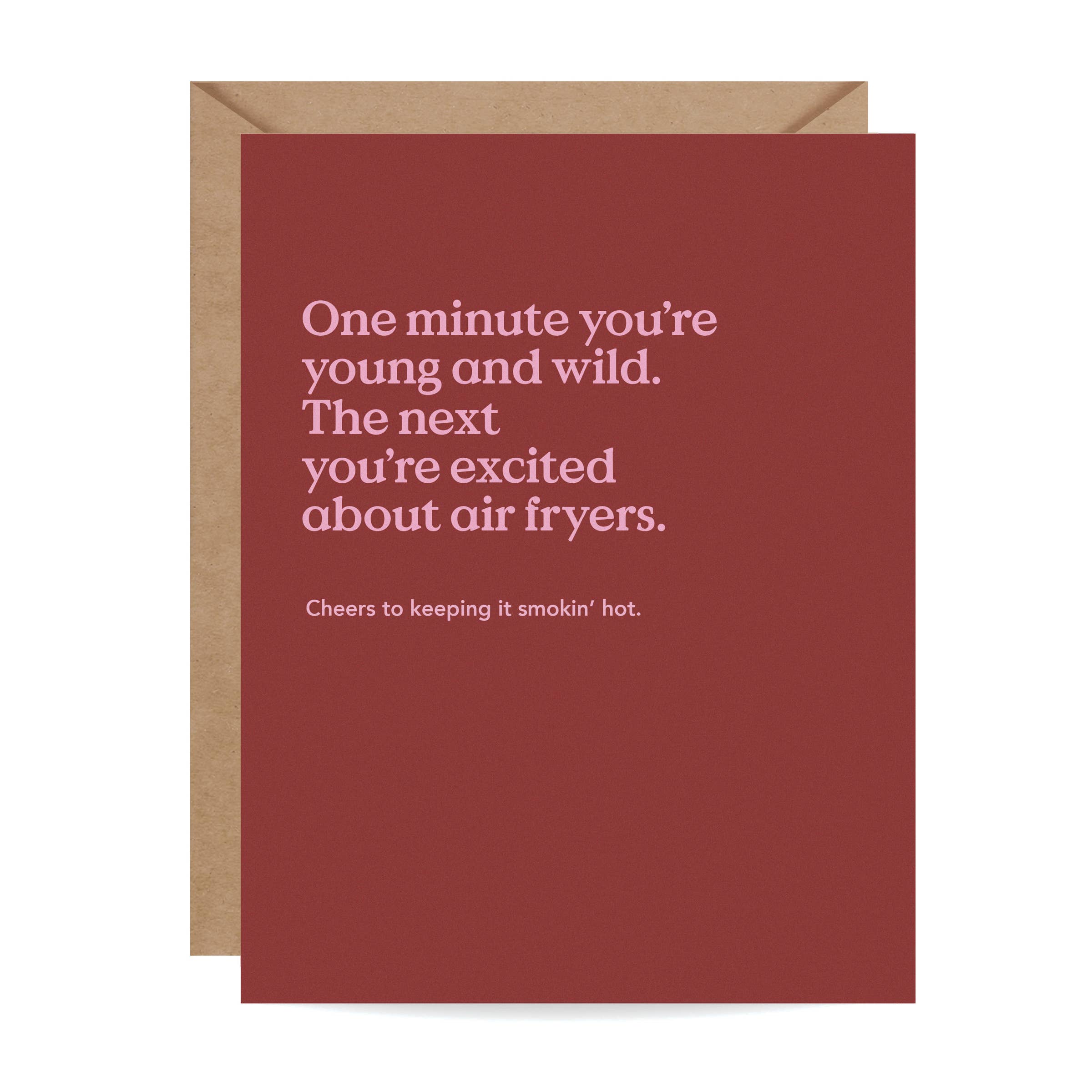 One minute, you're young and fun. The next, you have a favorite burner on the stove. • 4.25" x 5.5" (A2) • Individually packaged in a clear cellophane sleeve • Offset printed using soy based inks • Sustainably sourced, heavy weight, luxe white card stock • Paired with a coordinating recycled kraft envelope • Blank inside Funny Birthday Cards • Happy Birthday Cards • Funny Just Because Cards • Blank Cards • Funny Cards • Funny Greeting Cards