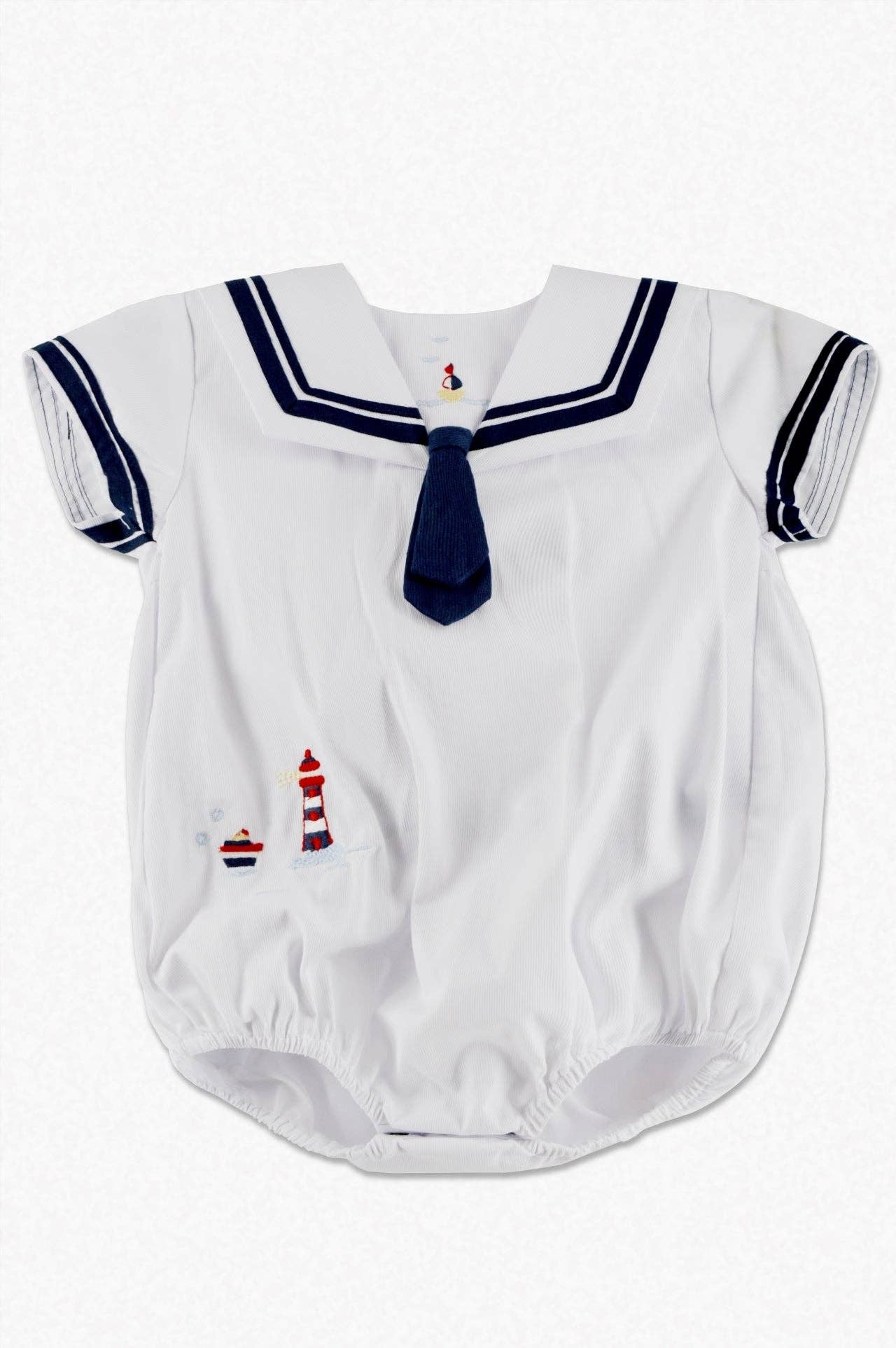 .Cotton seersucker suspender shorts with clip-on necktie .Poly cotton shirt .Made in U.S.A.