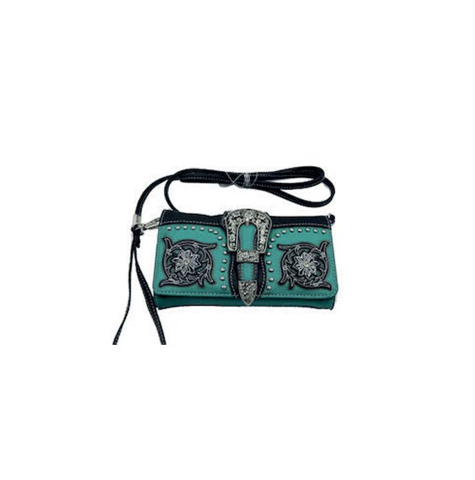 Crossbody/Hip Bag with detachable shoulder strap. Hand tooled, vegetable tanned, and hand stained genuine leather. Front of the bag has a zippered pocket. Back of the bag has a slip pocket. Inside has an open pouch. Push snaps on each side of the strap allow this bag to be worn as a crossbody or on belt loops as a hip bag. Each handbag includes a protective storage bag. Every American West product is hand tooled from hand dyed 100% leather cowhide. This adds to the beauty and individual variations to make your American West product truly unique. Zipper closure. 8 x 6 x 1" Shoulder Strap: 24" drop