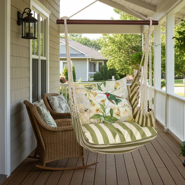 Handcrafted hammock swing set perfect for relaxing on a patio, porch or living room. Each set includes: swing with a 33" wood bar, 24x24" bottom stuffed pillow, 19x24" back stuffed pillow and tote bag. Made in El Salvador of sundure polyester that feels like cotton and pine wood. For use indoors and outdoors. Weight capacity: 250 pounds