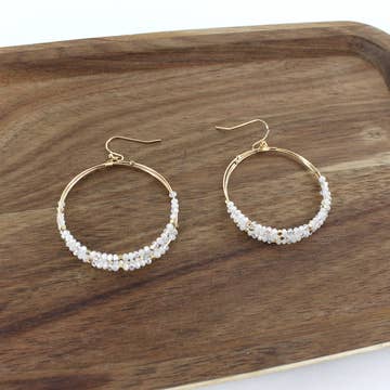 Large brass crescent moons are intricately wire-wrapped in with custom mixes of teeny tiny seed beads. Available in: * Snow White Moon Mix * Turquoise Sky Mix * Midnight Blue Mix * Golden Crescent Mix * Lavender Moon Set on hypoallergenic brass earring hooks. Moons measure 2ish inches. Earrings come set on 90% post-consumer recycled paper earring cards.