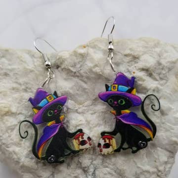 Wear your witchy, whimsical pride on your ears with handmade, lampworked glass witch hat beads! Inspired by my proximity to Salem, MA and love for Halloween, I make the beads with various spooky glass colors and shape them into witch hats that are around 1/4"-1/2" big. I add complementary colored glass accent beads to finish the earrings off. These babies come on sterling silver earring hooks and have the most perfect weight and jingle when you shake your head! All my earrings come on coffin shaped cards with foiled accents including my logo, and are secured with little rubber backings. If you would like to order certain color combos, please send a message along with your order!