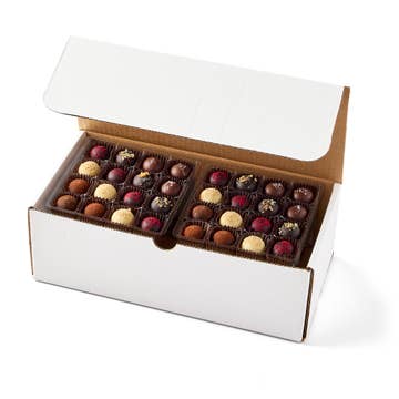 Introducing..... Maison Vosges! Vosge Haut-Chocolat's newest line! Developed with food service, candy stores, restaurants, bars, and catering in mind. Allow your customers and guests to indulge in our newest creamy truffles, bursting with flavor. Maison Vosges is our bulk line, featuring our new Ambient Luxury truffles. The Assorted box features a single 16-piece tray of all six flavors. Dark Belgian with Cocoa Nibs, Japanese Orange with Amanatsu Orange Peel, Milk Chocolate with Maldon Sea Salt, Red Raspberry with Raspberry Powder, Spiced Ginger with Cookie Crumbs and the most popular Key Lime Pie with Graham Cracker Crumbs. Shelf-stable for 6 months. Keep out of direct sunlight and store in a cool, dry place at 50-70°F for optimal quality. *note: toppings may vary slightly