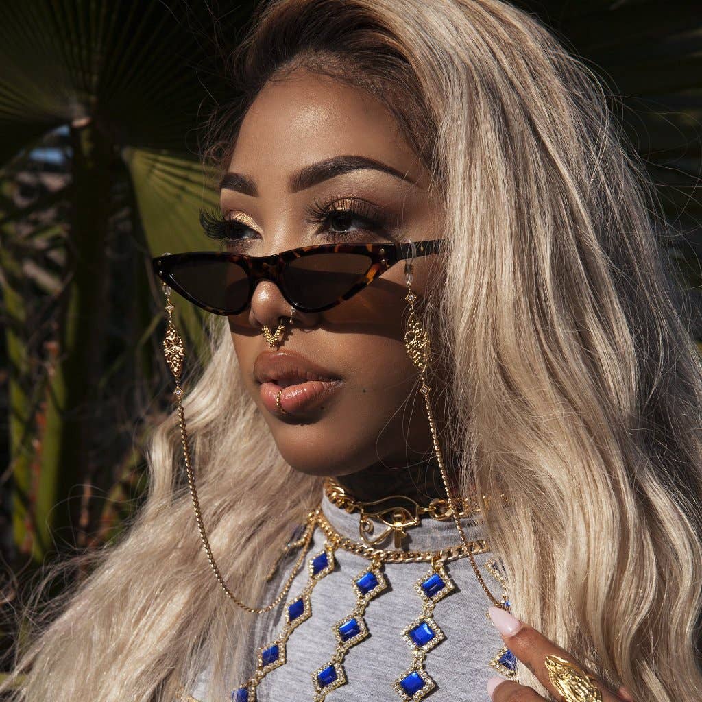 DETAILS • Exclusively Designed & Manufactured by Everley Grace • Gold Plated Metal Frame • Cat Eye Lens Shape • Black Tinted Lenses For UV Protection • Faux Turquoise Beads On Frame • Each Bead Is Individually Hand Glued • Includes Microfiber Dust Cloth & Protective Carrying Case MSRP: $64 MOQ: 6 PAIRS | RTS