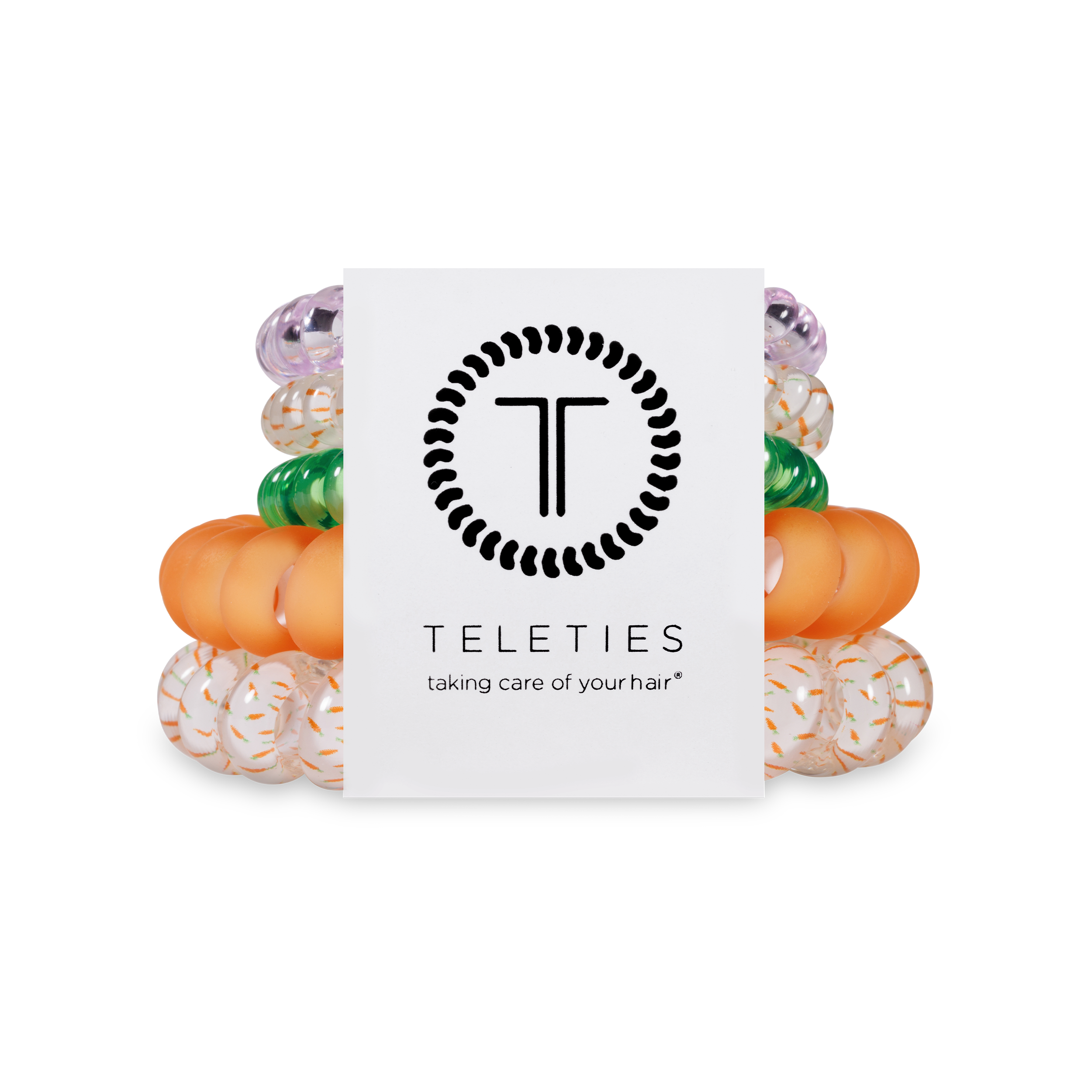Say hello to TELETIES Hoppy Days! Mixed Pack —the ultimate Easter-ready accessory! This fun mixed pack features cheerful orange, pastel green, purple, and a cute white tie with little carrots, adding a playful pop of color to your spring look. With a mix this cute, every day feels like a hoppy celebration! This mix pack features 3 Small Hair Ties and 2 Large Hair Ties!