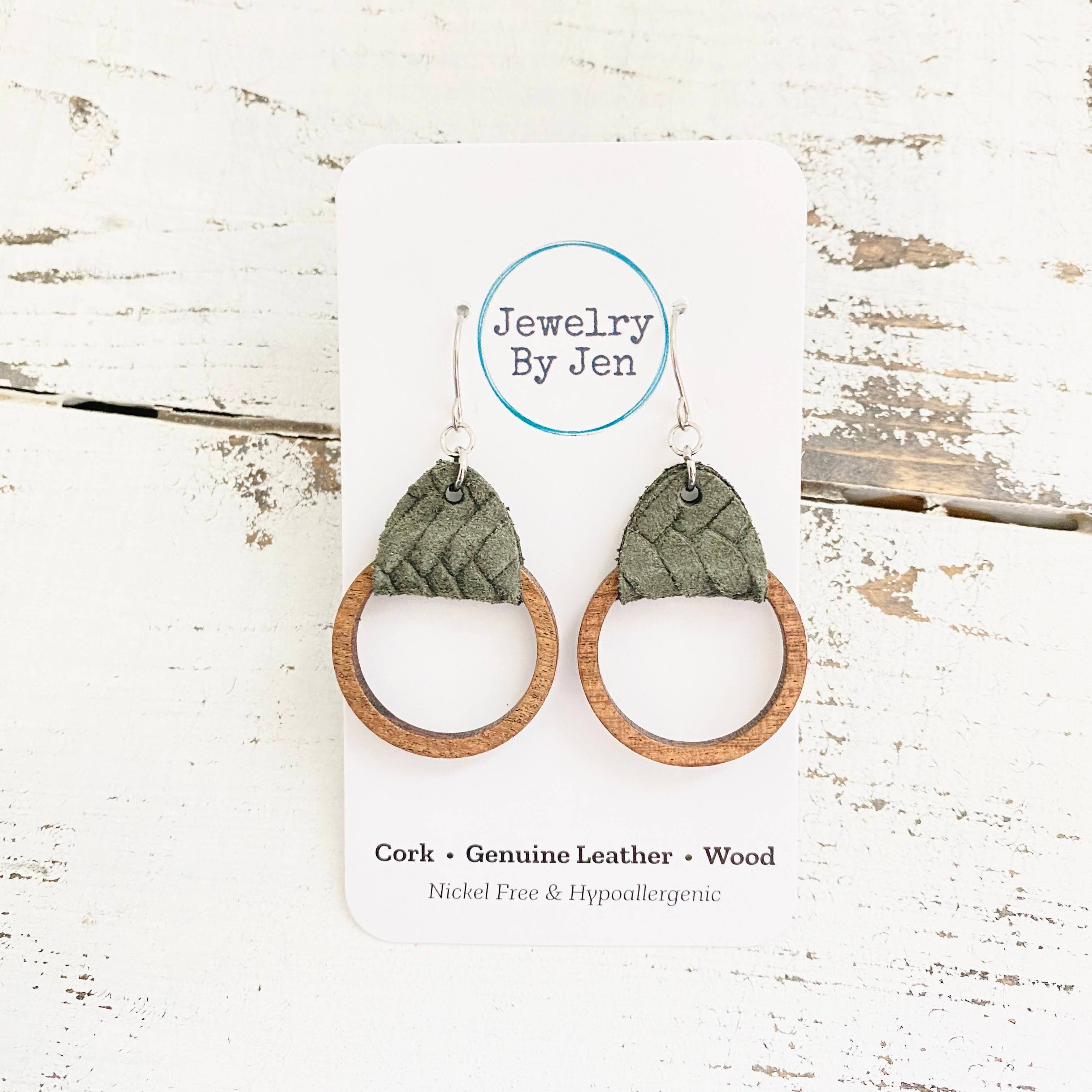 Wood Hoop Earrings: Pine Green Braided