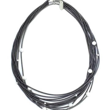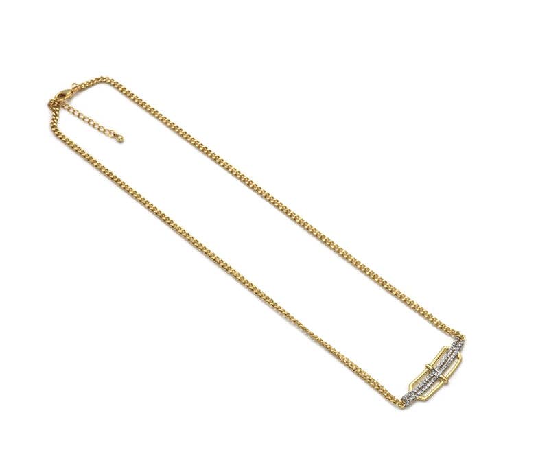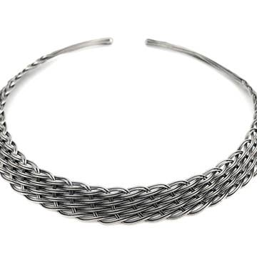 The geometric choker is an easy-to-wear eye-catcher. Its silvertone glints in the light. Works great with low-cut shirts, but layers well over a higher-collared top as well.