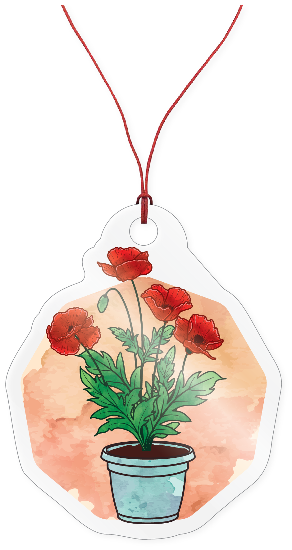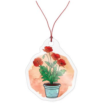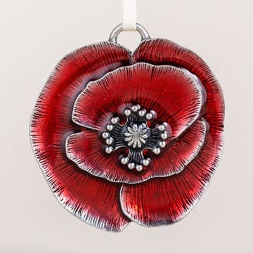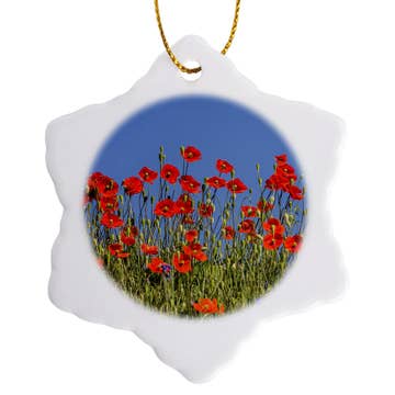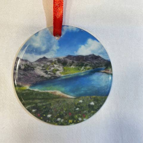 2.75” round ceramic ornament featuring the original chalk pastel painting “There's No Place Like Home” - poppies near Durango, Colorado. .2" thick. Image is printed on one side with Duck Girl Art logo on opposite side; red ribbon included.