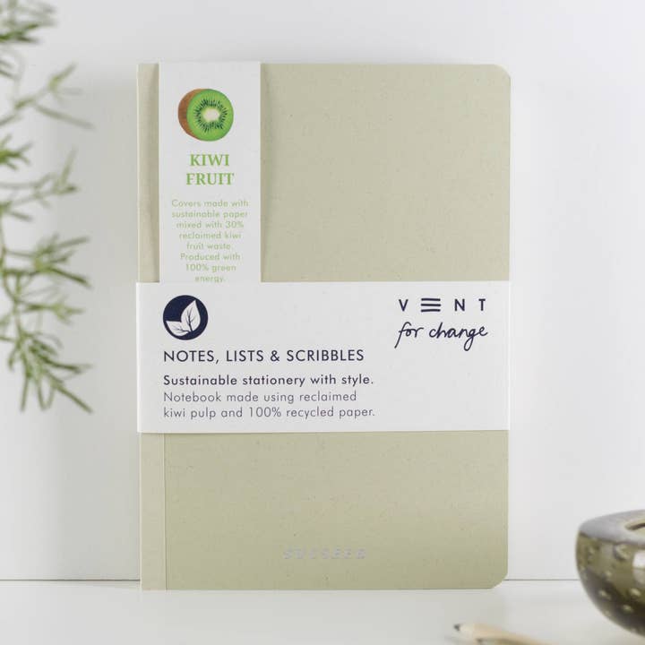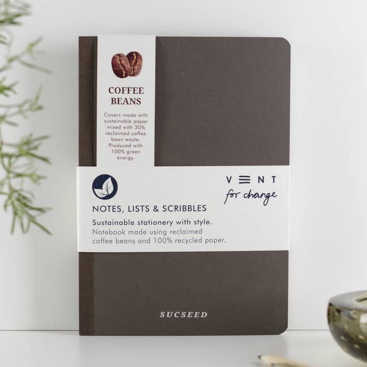 Stunning and stylish A5 notebook. Covers made using reclaimed cherry husk mixed with recycled paper. Foil embossed to front cover in silver with SUCSEED design. Back cover cherry fruit design in silver. Each book comes with lined, plain and numbered notes throughout. Page marker supplied as standard. A beautiful gift or treat for yourself. A5 (150 x 210mm) 100% recycled covers 80 sheets, 160 pages 80gsm recycled paper (removeable). Lined, plain and numbered notes pages throughout. "At VENT we give 5% of our our net sales turnover to existing school and education projects worldwide. This isn't based on profits, (they are hard to come by). It's from our first sale to our last. That's our promise."