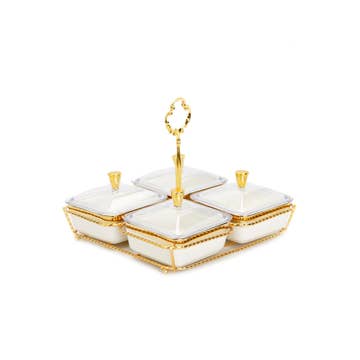 CER2697WG Footed Bowl from our Golden Salerno Collection. Perfect for presenting fruit or vegetables or use as a centerpiece. Striking and elegant gold titanium beading with high-fired white porcelain. Food safe. Dishwasher safe. Oven safe to 550°. Easy Care.