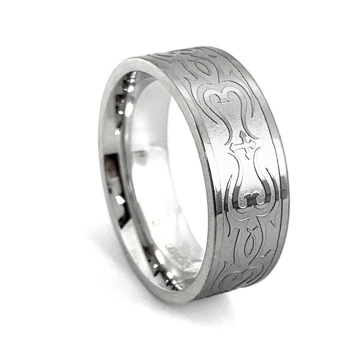 I am my beloved Ring HebrewItem code RSS6 - I am my beloved Ring Hebrew is a hypo allergenic stainless steel spinner ring. This was designed and inspired from the Holy Scriptures that features the first part of Song of Solomon 6:3. The scripture form the Bible reads; "I am my beloved's, and my beloved is mine" We wanted the text on this ring to stand out so we used a brushed finish. This spinner is a classic fully functional spinning device. It was designed to have a very unique feature that includes on one side of the spinner that has the etched I am my beloved's, and my beloved is mine (Song Of Solomon 6:3) in Hebrew style text translation. The other side is the etched English translation that wraps all the way around the entire band.
