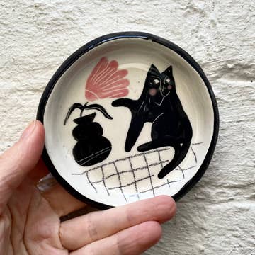 Jewellery dish, handmade and hand painted. Black and pink on white background. Various cats and flowers pattern. Earthenware.
