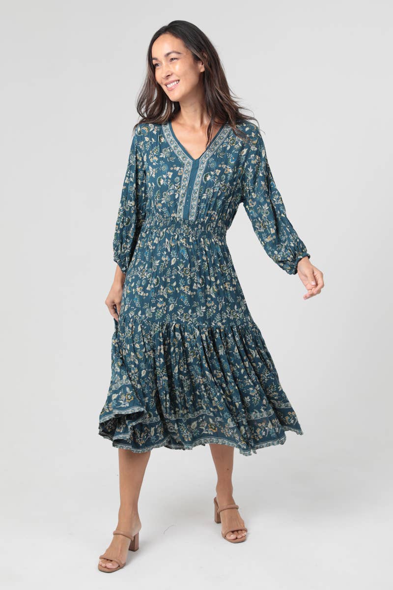 WHOLESALE FLORAL PRINTED V-NECK RUFFLE BOTTOM MIDI DRESS