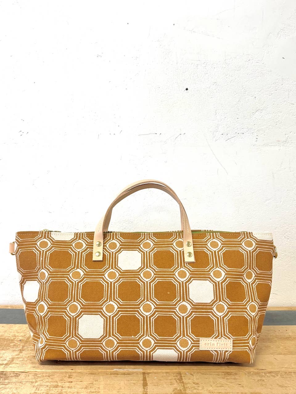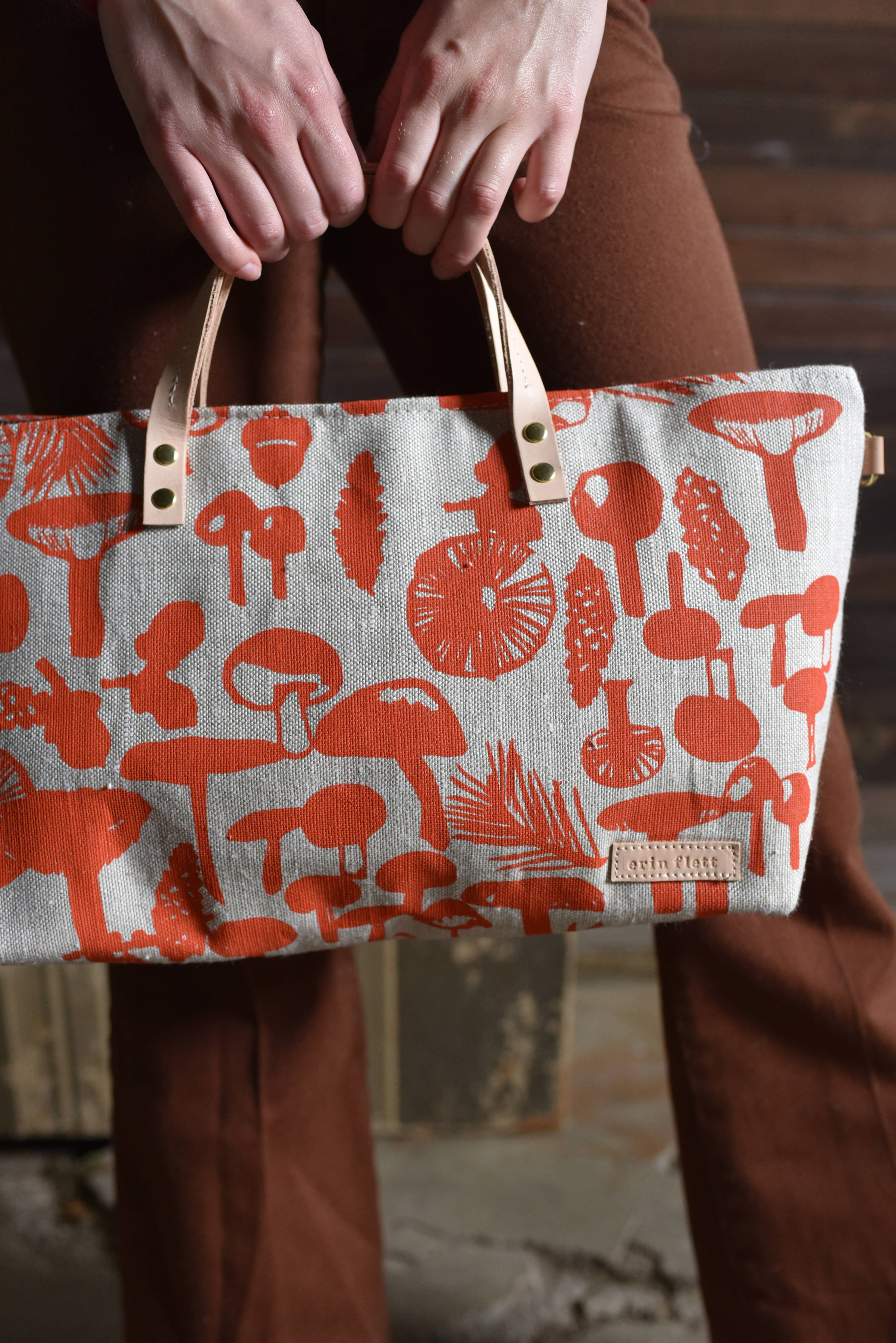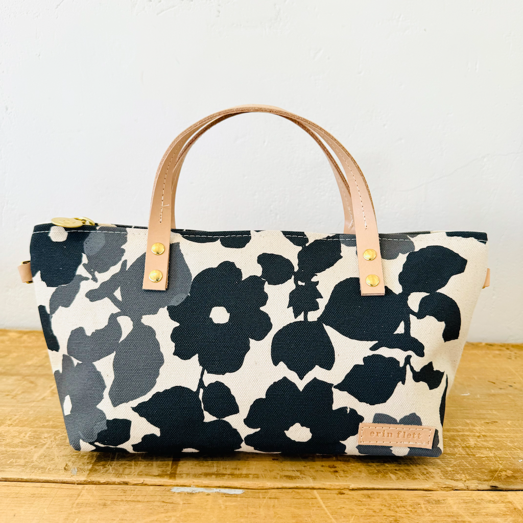 The cutest little crossbody mini bag. Replacing the Jen Bag in this collection, is this new little mini me. I love love this new shape. It has all the things, heavy canvas hand printed with double thick handles. 8 brass rivets and a slip pocket inside. We also attched 2 d-rings so you can add one of our canvas or leather adjustable straps. Designed + Hand Printed + Sewn in Maine. Print: 2 color screen print Size: 6" Tall 14" Wide 4" x 9.5" base 4" Deep Cute double-thickness leather handles Material: Heavy Cotton Canvas, Brass Hardware, Leather Detail Care: Spot Clean Only Top Handle Bag Designer Hand Bag Top Handle Purse for women Satchel Shoulder Bag Crossbody Bag for women ShoulderSatchel Bag Small Crossbody Compact Crossbody Bag Clutch with Leather Handle Mini Bag Small Purse Small Bag Small Canvas Bag