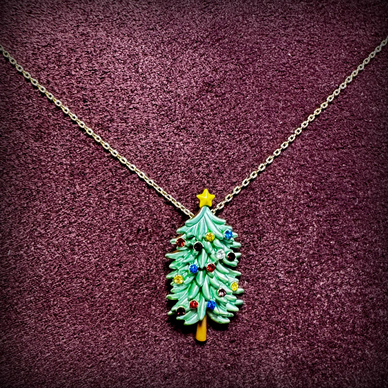 Christmas Tree brooch, with hand enamelled green branches, yellow star and multicoloured diamante twinkling lights. Designed by us in our London office. This brooch embodies nature, with its intricate design and attention to detail. Bring a little festive joy to any outfit this Christmas season with this fun brooch, with the twinkling lights adding just a touch of glitz and glamour! Brooch: (L) 45mm x (W) 22mm Each item is presented on a recycled paper gift card (as shown), packed in biodegradable bags. The Brooch has a safety catch on the pin to secure it. This is just one design from a range of classic flower jewellery. All our products conform to EU directives on safety.