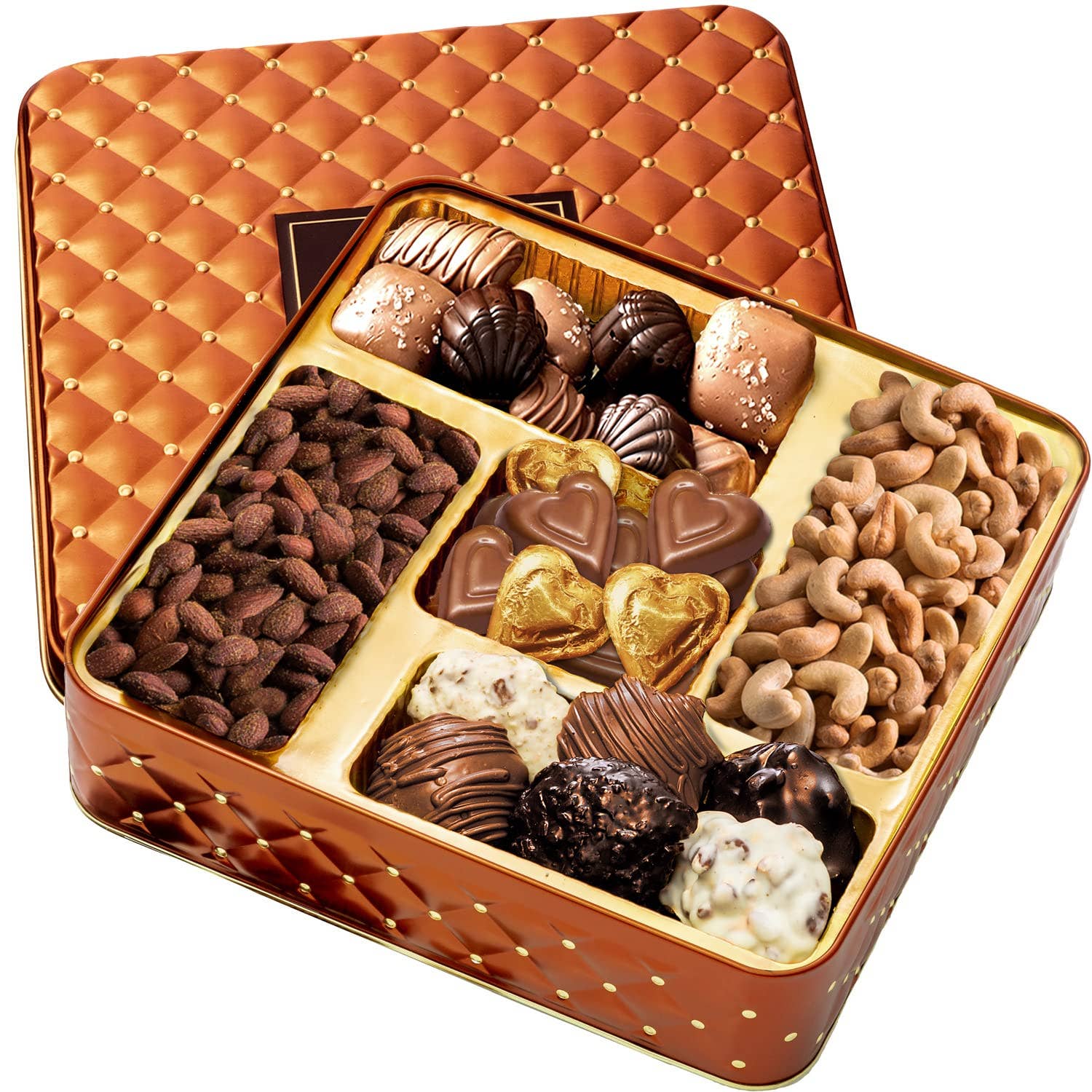 But First, Chocolate Gift Box Our Extra Large Chocolate Gourmet Gift Basket is a luxurious, oversized assortment of premium chocolate snacks. From silky truffles to chocolate-covered nuts, every treat is hand-selected and beautifully arranged for maximum impact. Whether you're celebrating a holiday, birthday, milestone, or sending a corporate thank you or condolence gift basket, this indulgent chocolate gift basket is guaranteed to impress. What's Included In This Gift Tin: Chocolate Peanut Clusters, Milk Chocolate Almond Clusters, White Chocolate Butter Pecan Clusters, Chocolate Peanut Butter Square, Chocolate Peppermint Patties, White Chocolate Pretzel Clouds, Pecan Snappers, Dark Chocolate Haystacks, Sea Salt Caramels, Double Dark Silk Shells, English Toffees, Pecan Meltaways. Why It’s the Ultimate Chocolate Gift: Extra large size perfect for sharing or making a statement Curated selection of premium chocolate treats Ideal for holidays, birthdays, client gifts, or any celebration Arrives ready to gift—no wrapping required. Quick shipping and delivery. This Product is Kosher Certified by Quality Kosher Supervision- Dairy