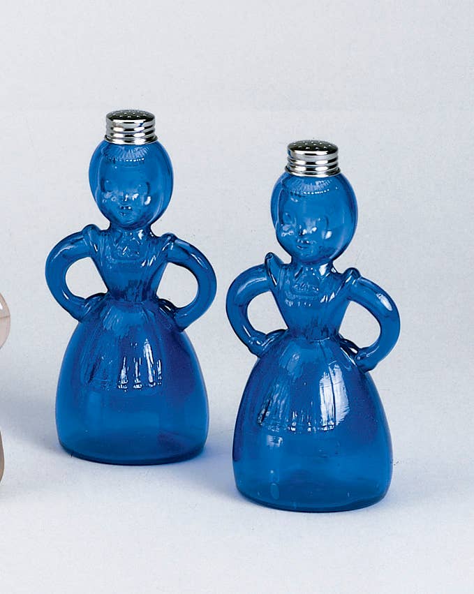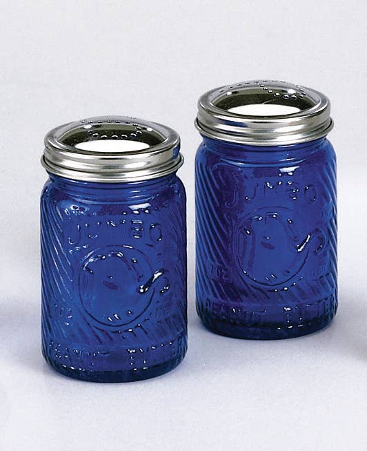 A pair of cobalt blue glass shakers featuring raised character detailing and polished metal lids, designed for both display and tabletop use.