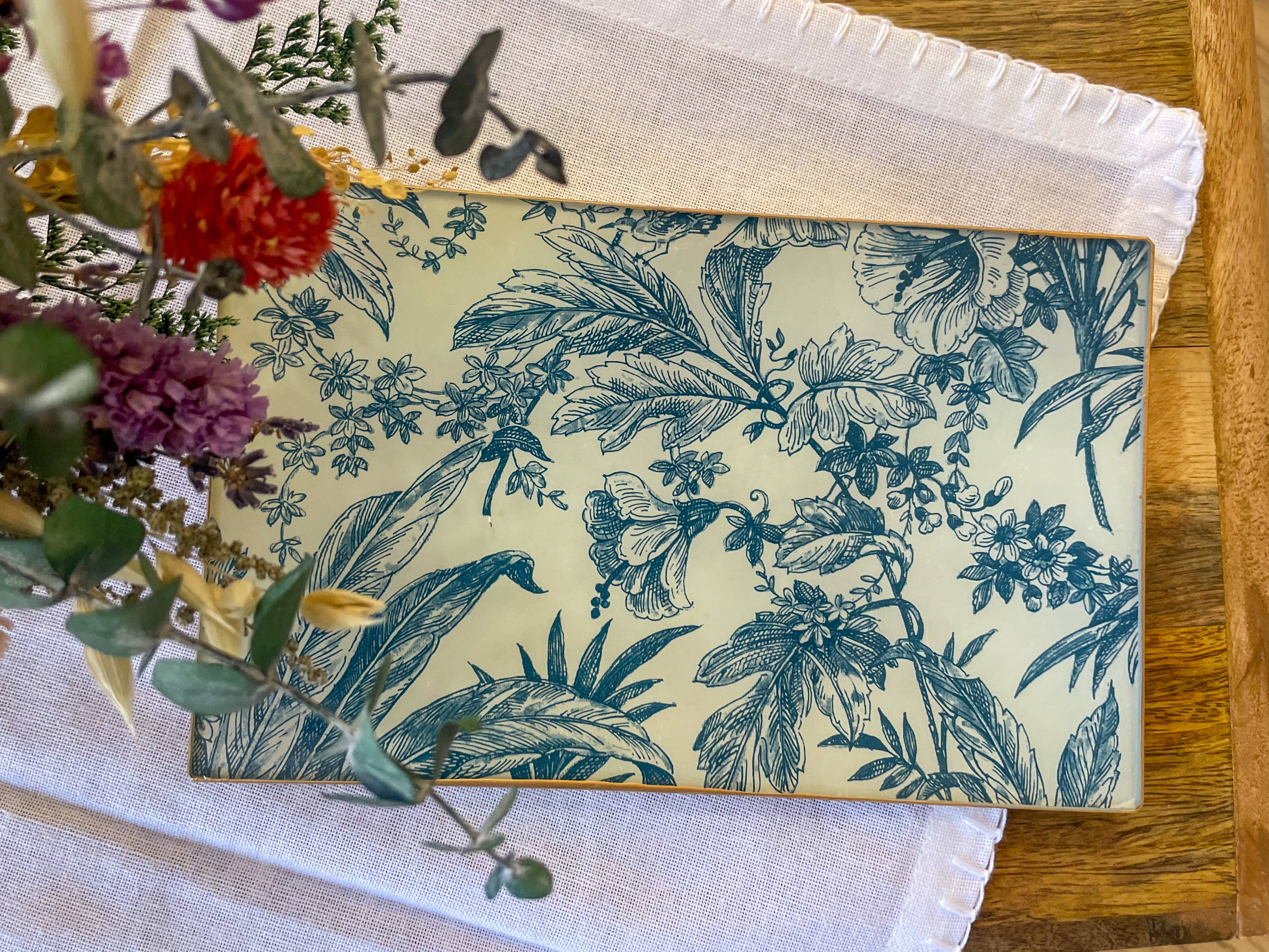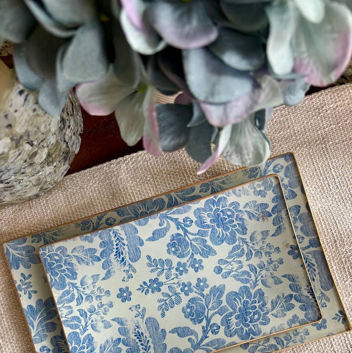 Ginestra Collection Our rectangular glass plates are handmade using traditional decoupage techniques, offering a refined yet versatile design suited for modern tabletop and home décor settings. Each piece is crafted in small batches and finished by hand in Massachusetts. The elongated shape makes these plates especially functional for serving, styling, and display, while the layered decoupage finish adds depth, softness, and visual interest. No two pieces are exactly alike. A strong fit for boutiques and lifestyle stores seeking distinctive, artisan-made serving and décor pieces. They work beautifully as: • Serving trays for appetizers or desserts • Coffee table or console styling • Jewelry, keys, or catch-all trays • Gift and seasonal displays Details: • Material: Glass • Handmade using traditional decoupage technique • Each piece is unique; slight variations are part of the handmade charm • Made in the USA (Massachusetts) Available sizes & designs: > Mini: 4"x6" > Small: 5x8" > Medium: 6x10" Buyers may select preferred sizes and patterns when ordering.