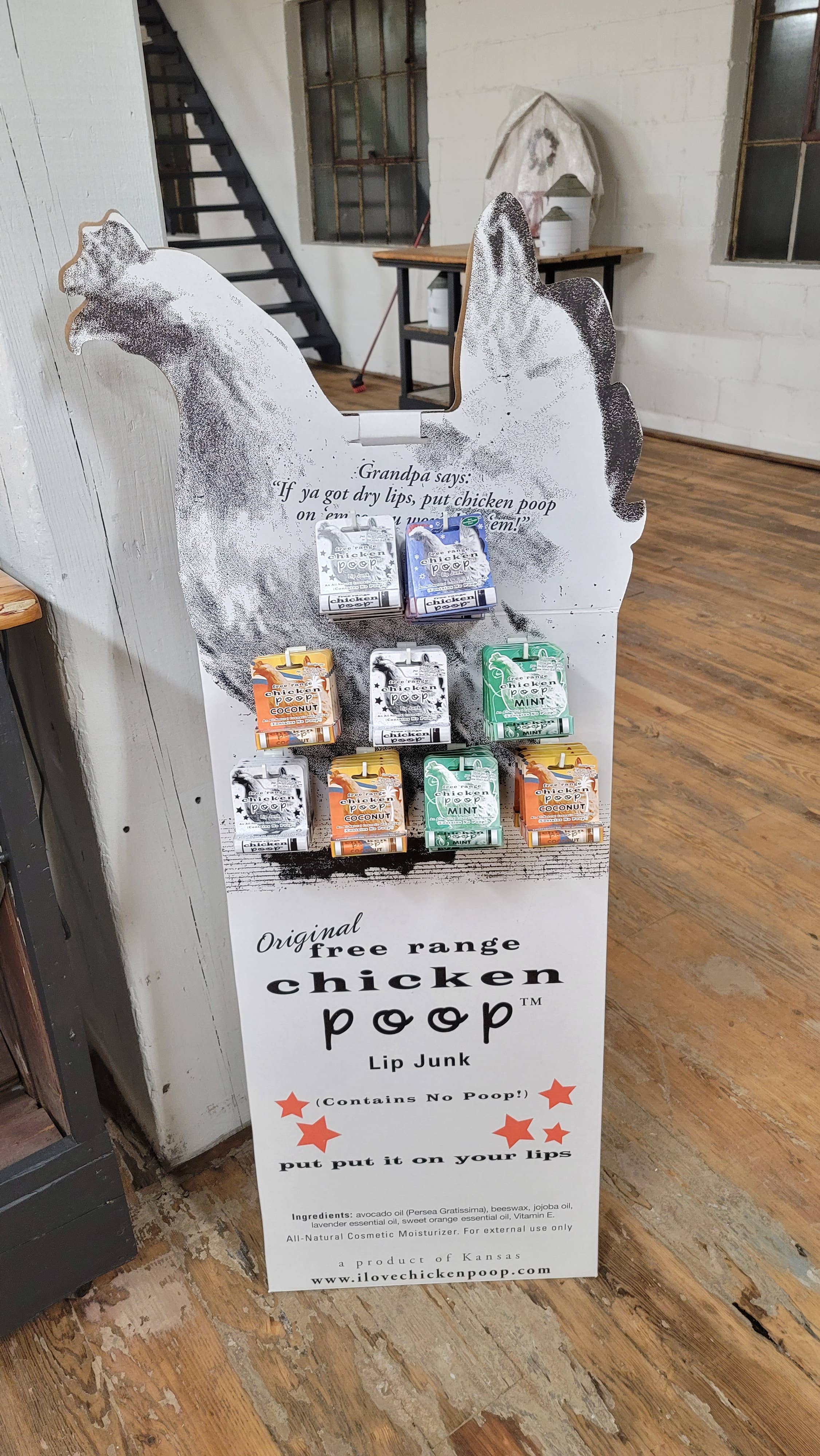 The perfect blend of humor and hydration for your store! Don't let the quirky name fool you—this lip balm is all about keeping your lips soft and moisturized with a playful twist. Floor display is approximately 3' tall and includes an assortment of ORIGINAL, COCONUT, & MINT Chicken Poop® Lip Balms with their very own hang tag so shoppers can pick their favorite. Each balm is crafted with natural ingredients to ensure your lips are pampered without any harmful chemicals. Whether you're looking for a unique gift or simply want to add a dash of fun to your daily routine, the Chicken Poop® Lip Balm is sure to bring smiles and smooth lips to all. Simple Ingredients / Gluten Free But why, you ask is it called Chicken Poop®? Old Farmers would joke any time you complained of having chapped lips…”let's put some Chicken Poop on your lips so you won't lick ‘em!” Chicken Poop® Lip Junk was first created in a kitchen 21 years ago and today, is in over 8,000 stores. Put, put it on your lips!