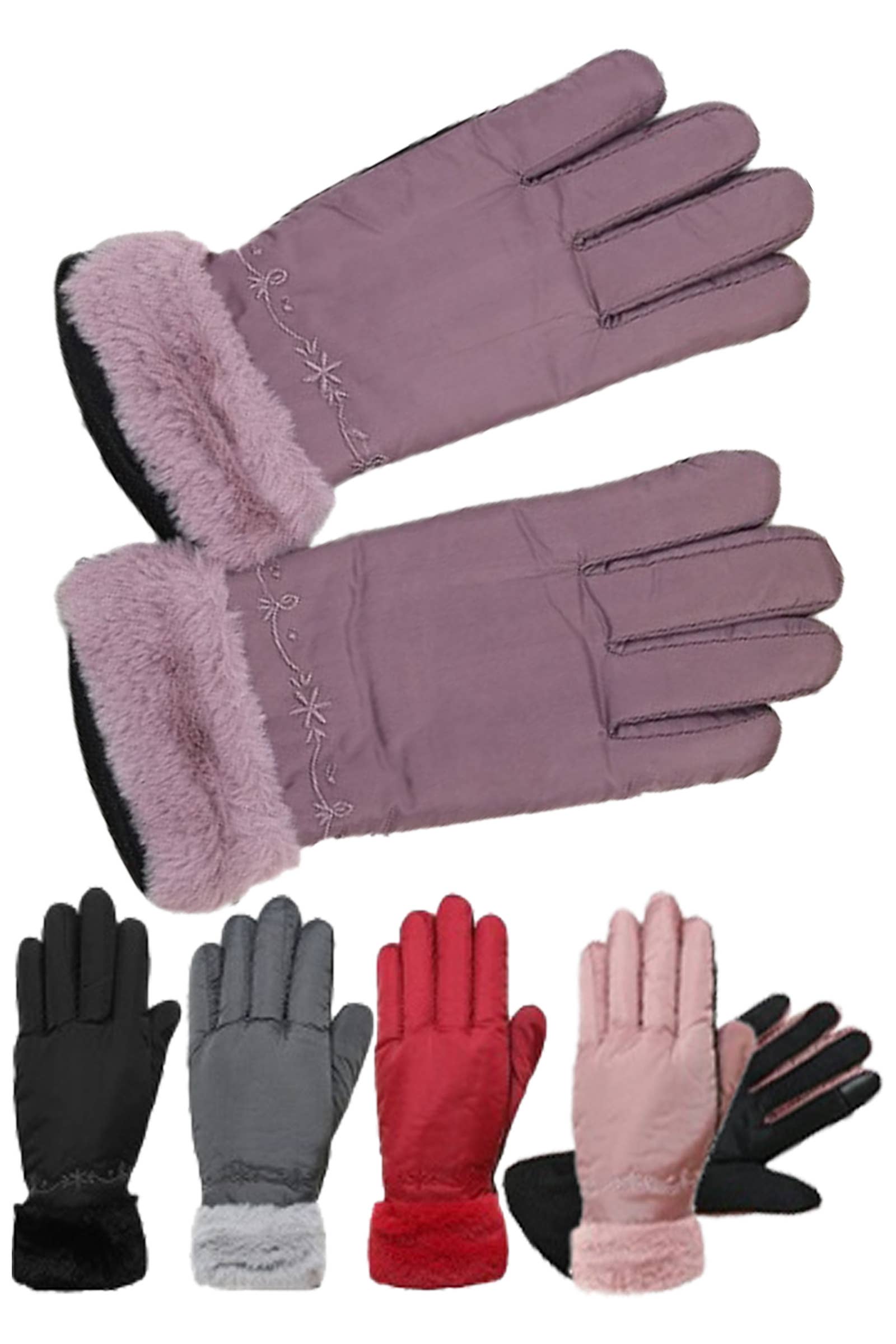 Women's Faux Fur Cuffed Mini Rose Embroidered Water-Resistant Nylon Winter Gloves -Touchscreen Compatible Fingertip Anti-Slip Beaded Palm -Fuzzy Faux Fur Cuffed Wrist -Assorted Color (4-Black, 2-Burgundy, 2-Dusty Purple, 2-Powder Pink, 2-Dark Gray, May Vary) -100% Nylon/Polyester -CA Prop 65 Advisory