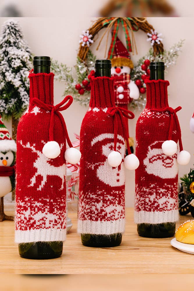 Festive Holiday Decor: Elevate your holiday table setting with charming Christmas-themed wine bottle sweaters. Quality Knit Material: Crafted with care for durability and a cozy holiday look. Versatile Holiday Decoration: Perfect for dressing up wine bottles at holiday gatherings and parties. Diverse Christmas Elements: Features a variety of classic holiday designs, perfect for creating a complete festive atmosphere. Holiday Spirit: Add a touch of festive cheer to your celebrations with these Christmas elements knit wine bottle sweaters.