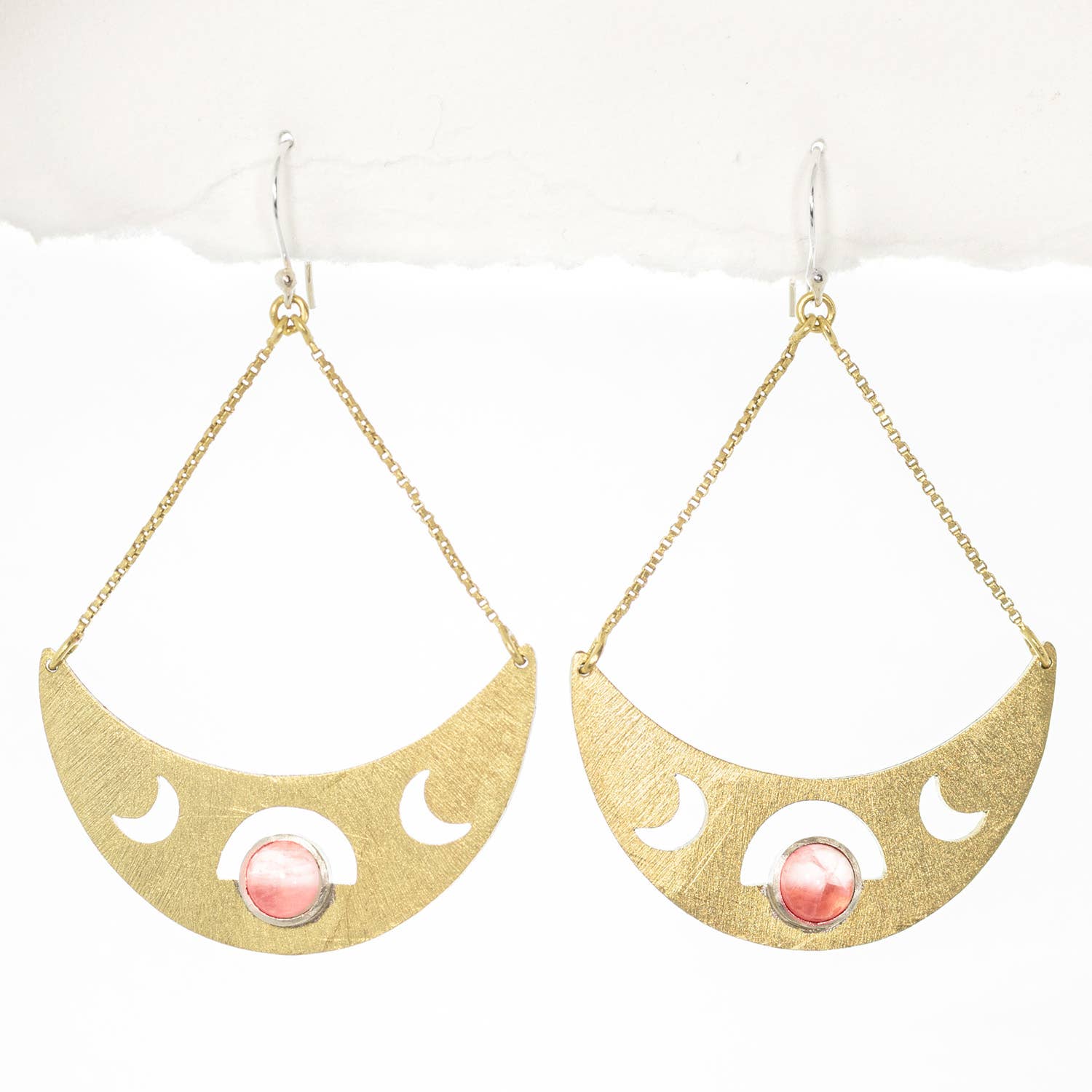 Medium Crescent Moon Earrings are hand cut and textured from lightweight metal. The medium size is a best seller and is a bold take on the this timeless shape. Medium Crescent Moon design measures 1.25 inches long and roughly .5 inches wide and are available in three metals: BRASS, COPPER, and NICKEL SILVER and hang on 1.5 inch ear hooks. Brass moons hang on gold plated hooks, nickel silver moons hang on sterling silver plated hooks, and copper moons hang on sterling silver plated hooks.  Kidney ear hooks are gold or silver plated brass, close in the back to prevent loss and allow the designs to hang facing forward. These earrings are textured and finished with a protective seal to help prevent tarnishing.