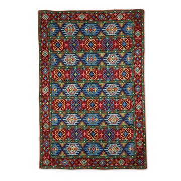 Step into a world of vibrant colors and intricate patterns with our exquisite handwoven rug. This masterpiece, measuring 11'8'' (356 cm) in length and 6'4'' (192 cm) in width, is a testament to the timeless art of rug weaving. Crafted with a blend of cotton and wool, this rug boasts a thickness of approximately 0.24'' (6.00 mm), offering both durability and comfort. This rug carries a rich history and a unique character that will add depth and warmth to any space. Design The design of this rug is a captivating display of multicolor patterns, featuring a harmonious blend of reds, greens, blues, and more.