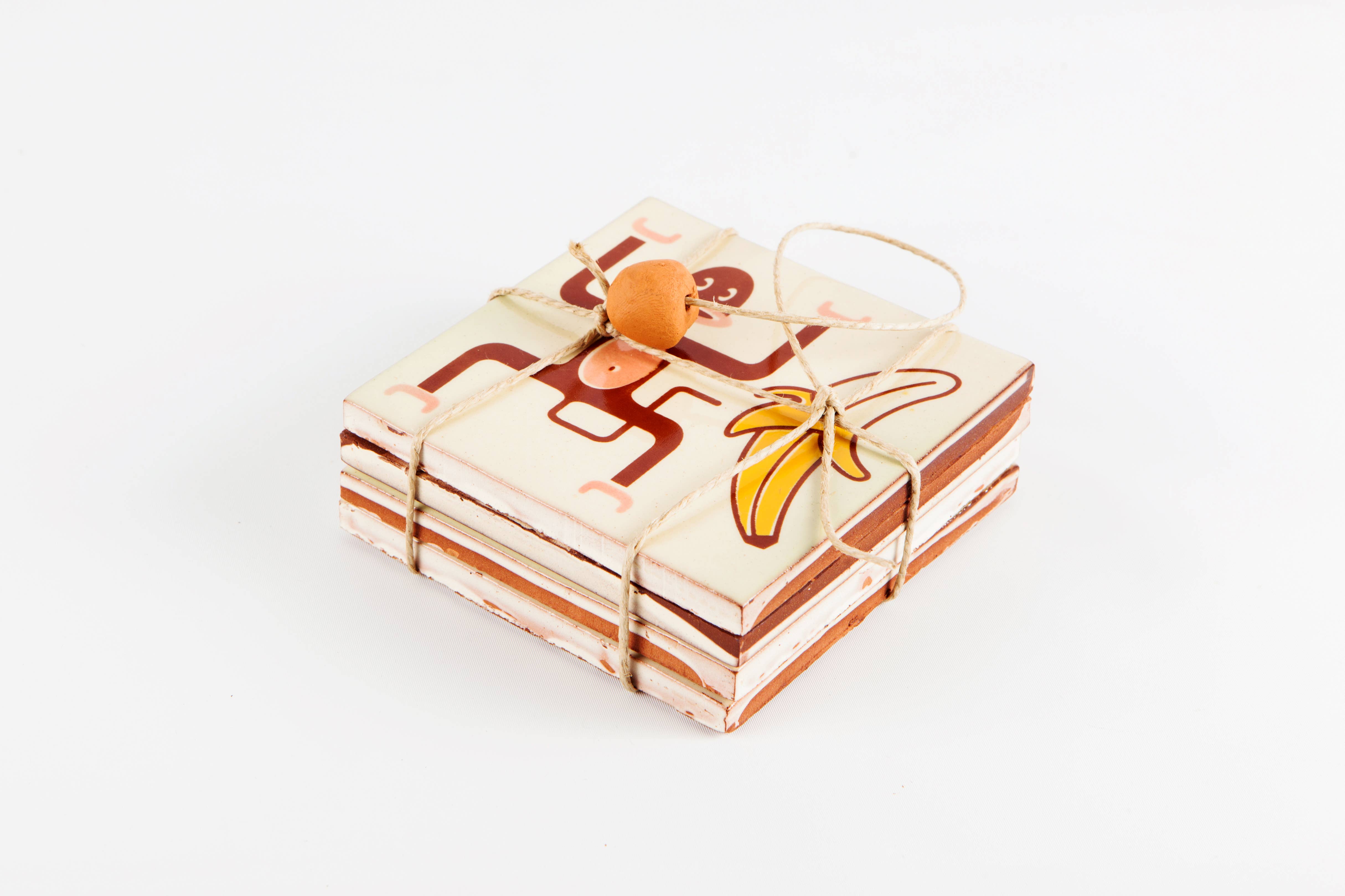 Set of 4 coasters measuring 10x10 cm, screen-printed by hand. Dimensions: 20 cm x 20 cm Supplementary Information: Each tile has a third pile backing. Materials: ceramic