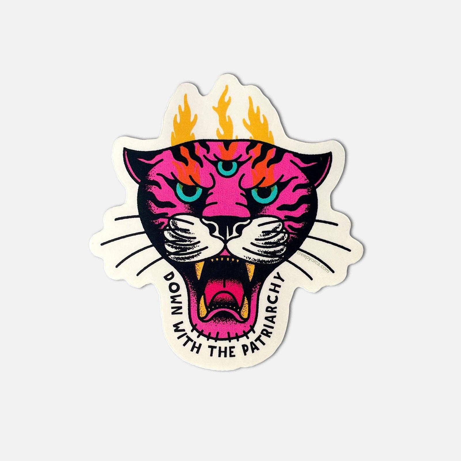 Unleash your inner rage kitten with our "Down With The Patriarchy" embroidered patch—featuring a triple-eyed hot pink tiger in bold, tattoo-style glory. Iron it on to make your stance clear: fierce, feminist, and fed the fuck up. MEASUREMENTS * Width: 3in / 76mm * Height: 2.5in / 63mm SPECIFICATIONS * Embroidered fabric patch * Iron-on adhesive backing