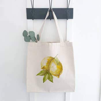 Graphic totes - Amalfi Coast squeez fresh arch letters with fresh lemons art printed Product Description: 12oz Heavy Canvas Standard Size Standard Length Web Handles Reinforces at stress points for extra durability Size: 15"W x 16"H Imprint: MAX 10"W x 12"H