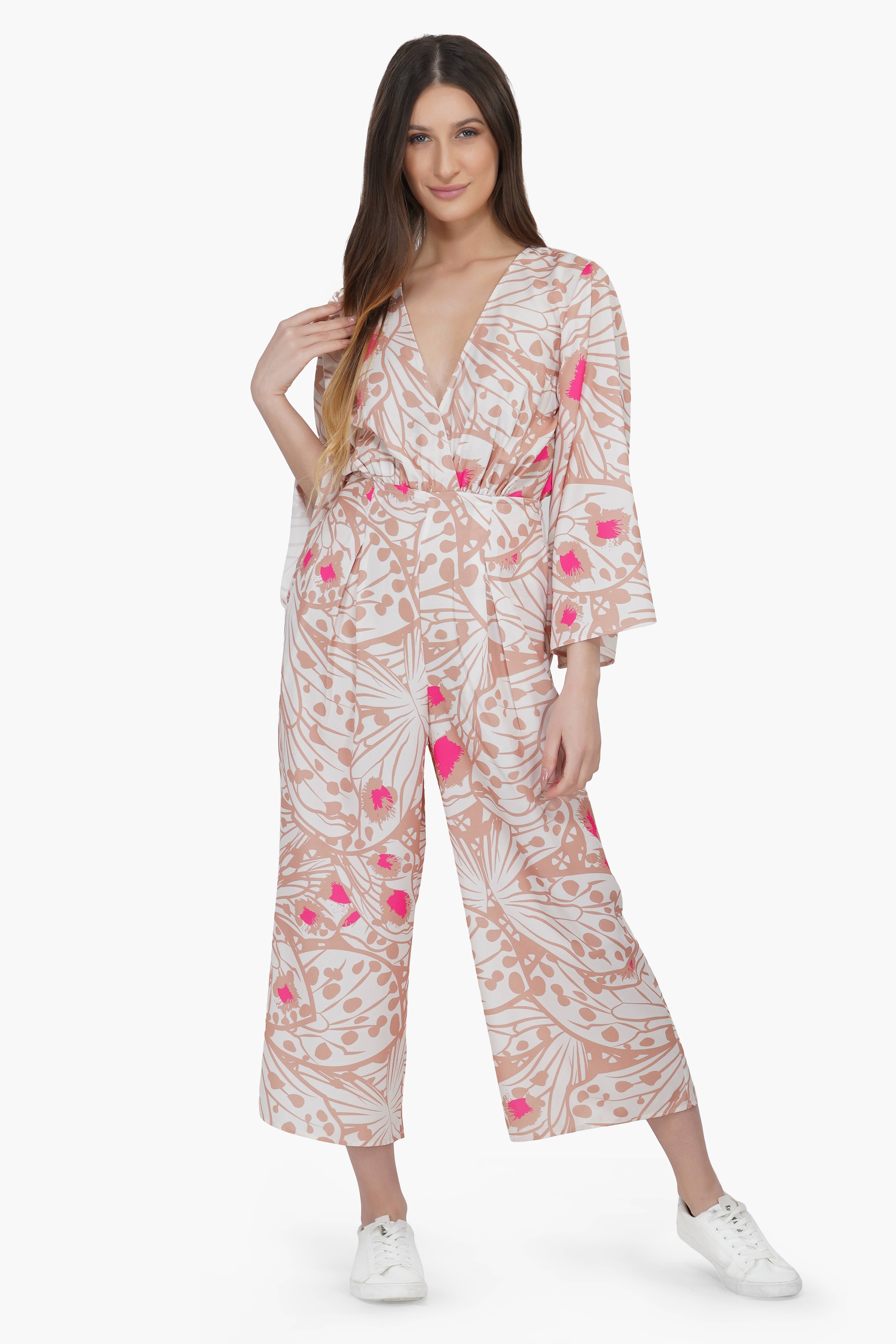 * Viscose Linen Oversized Floral Print * Jumpsuit Full Length * Bellbottom Pants With Side Zipper Insert * Pockets At Both Side * One Shoulder Jumpsuit * Thread Detailed Panel At Upper Body And Bodice Edge For Detail * Slight Gathers At Bodice Edge